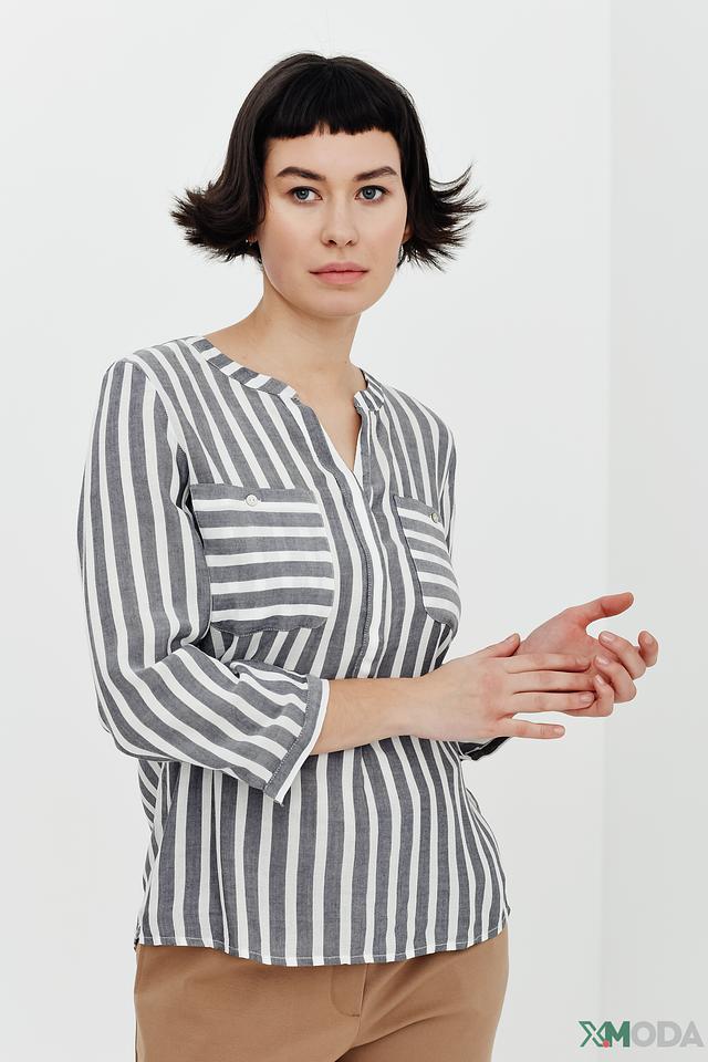 Блуза имеет классический крой с V-образным вырезом и короткими рукавами. Вертикальная полоска в серо-белой гамме визуально вытягивает силуэт и делает образ более динамичным.