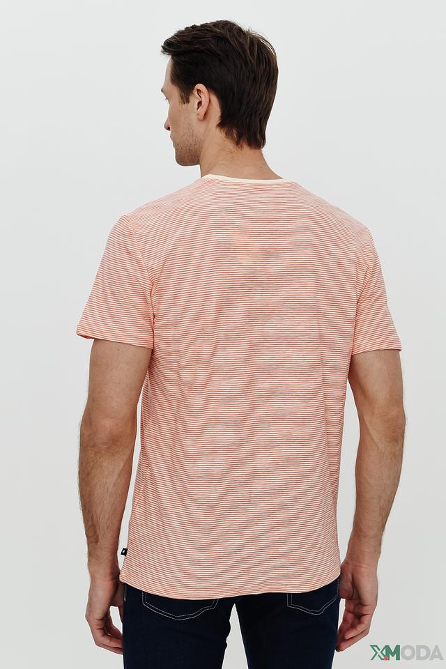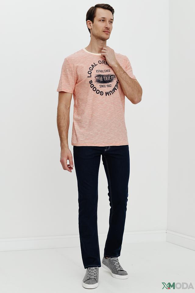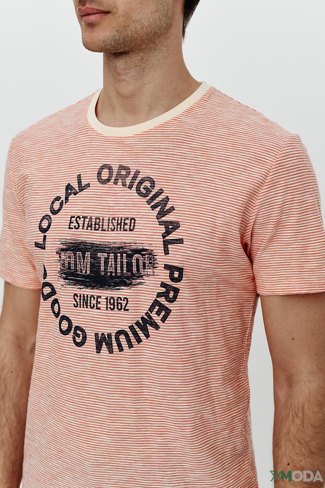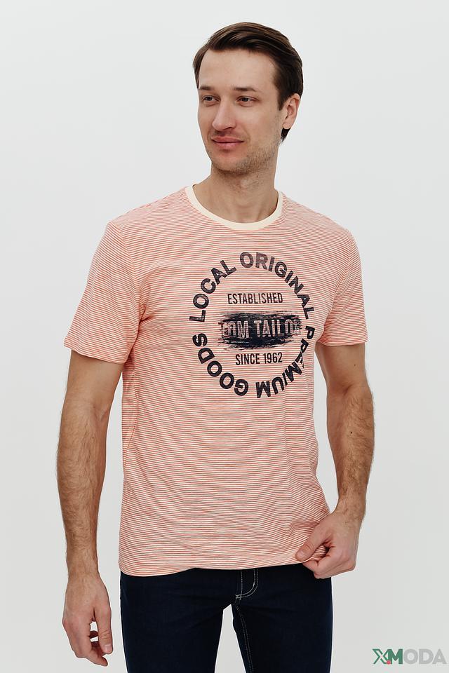 Мужская футболка Tom Tailor персикового цвета в тонкую полоску. Изготовлена из 100% хлопка, имеет круглый вырез горловины и оригинальный принт с логотипом бренда. Идеальный выбор для создания повседневного образа. Состав: хлопок 100%