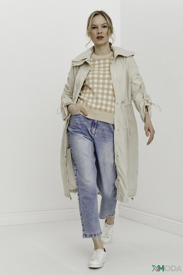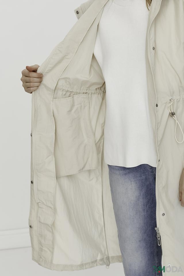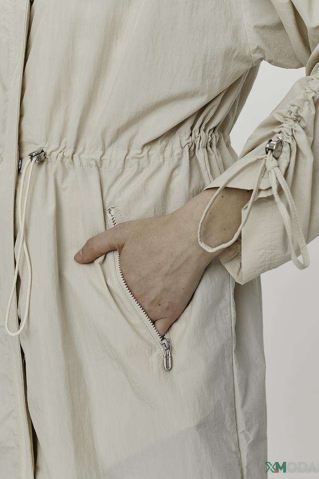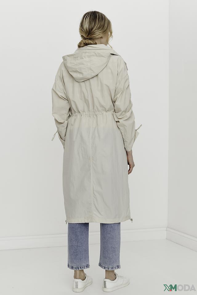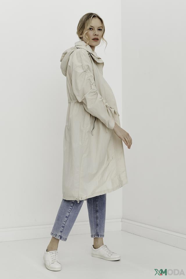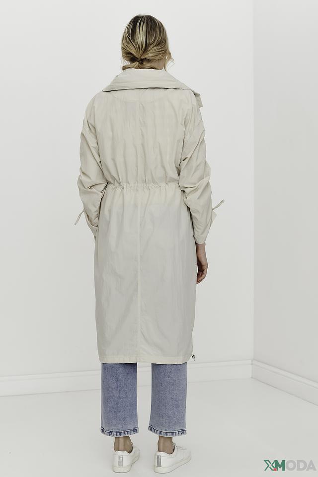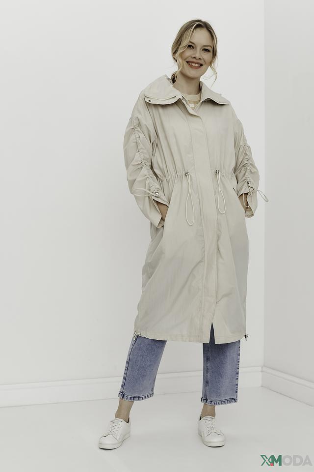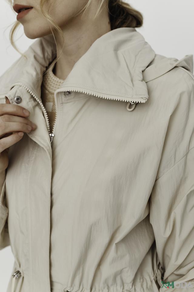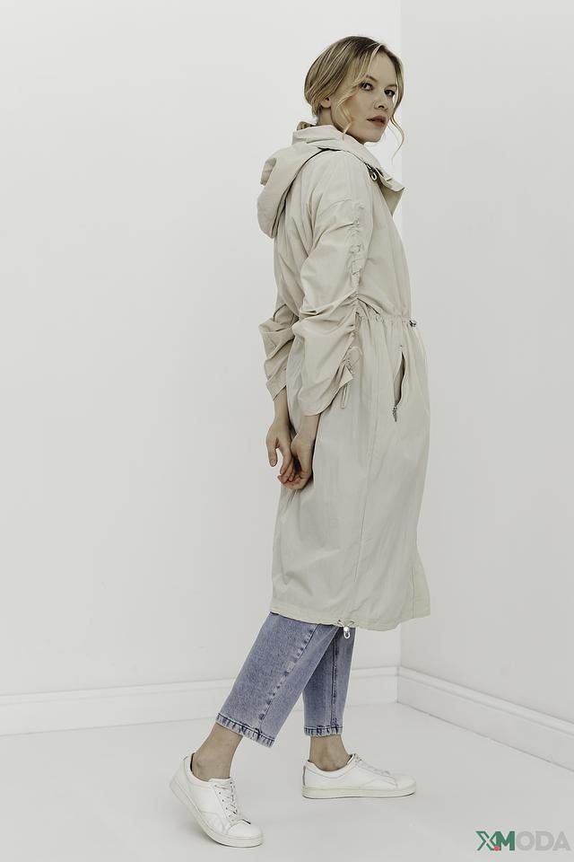 Плащ имеет прямой крой, капюшон и застегивается на молнию. Рукава плаща украшены декоративными сборками, создающими эффект "фонариков". Это придает модели оригинальность и женственность.