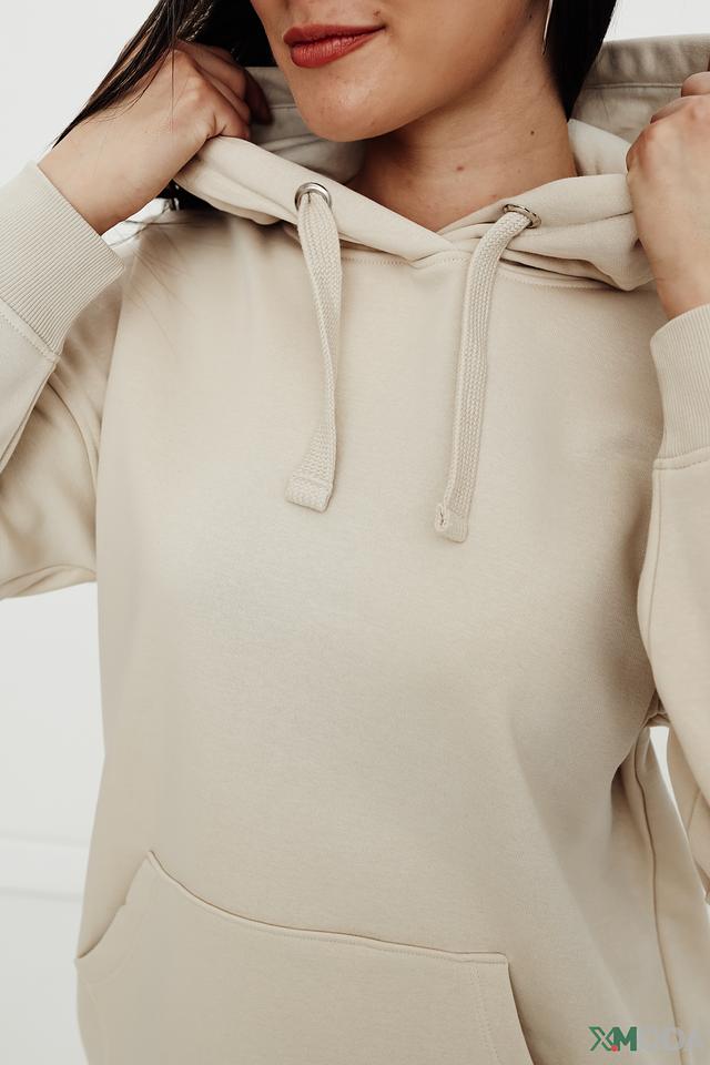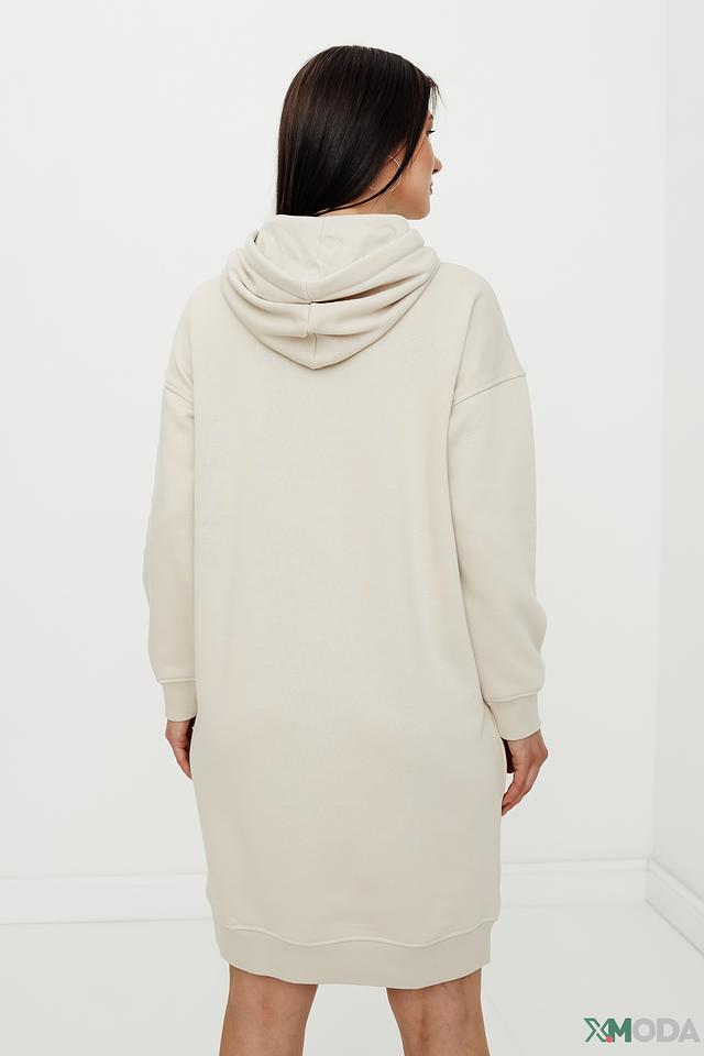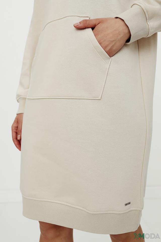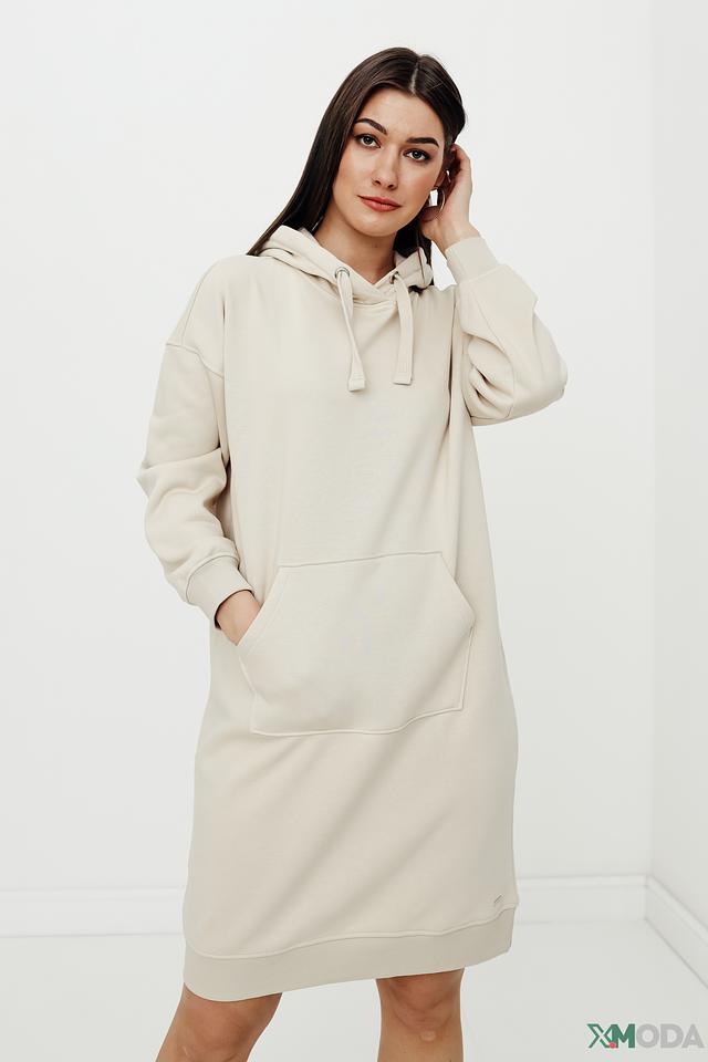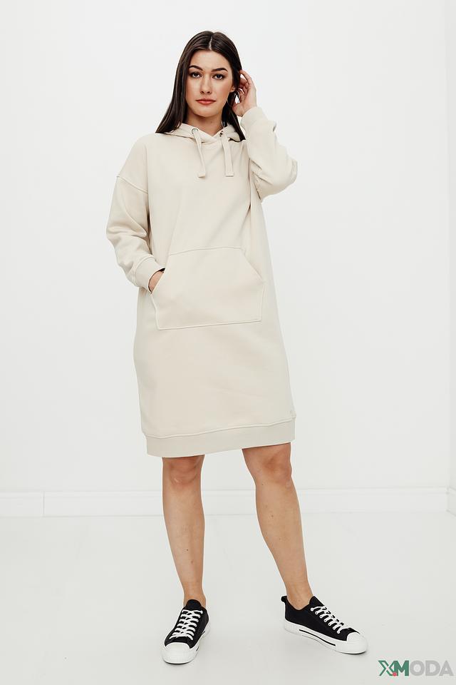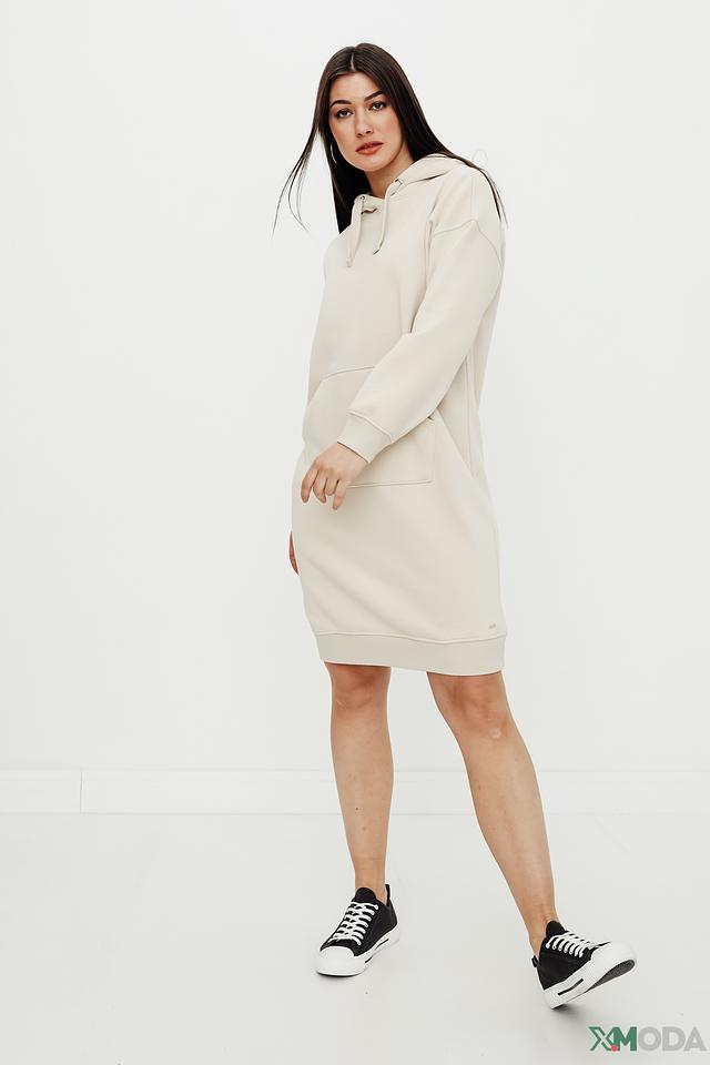 Это платье от Tom Tailor выполнено в бежевом цвете и имеет свободный крой оверсайз, обеспечивающий максимальный комфорт. Модель дополнена капюшоном и вместительным карманом-кенгуру на животе.