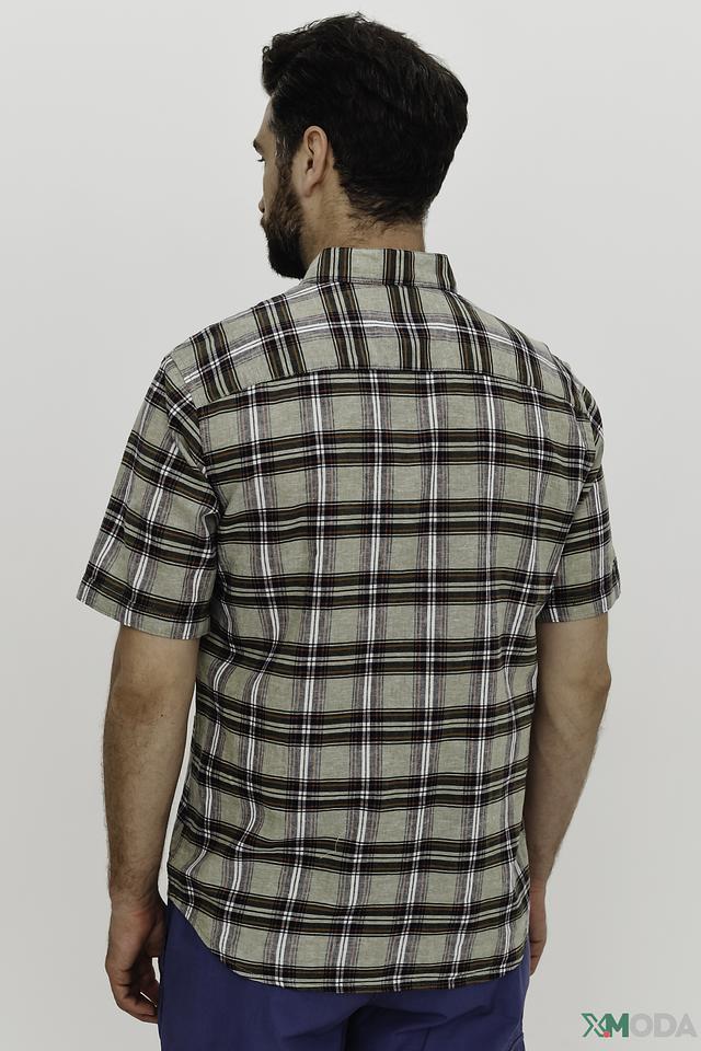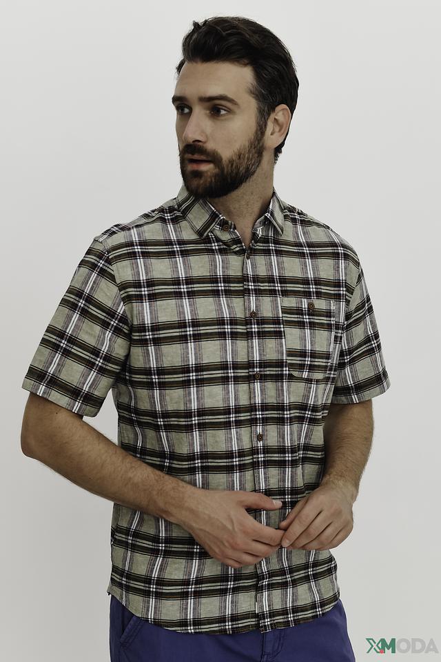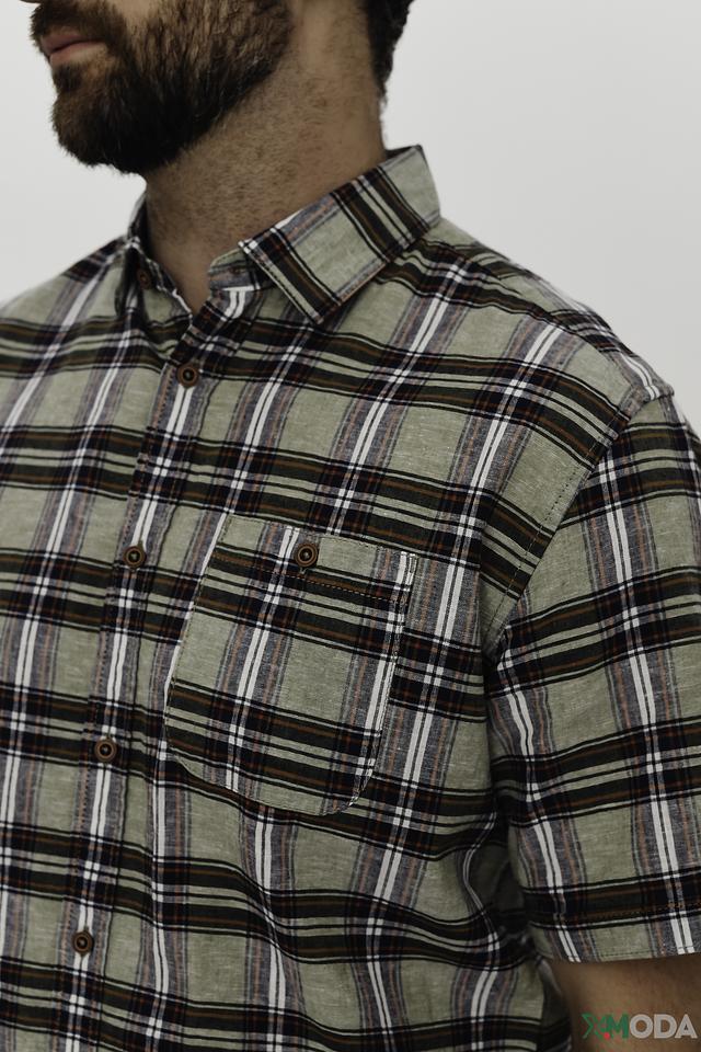 Мужская рубашка Tom Tailor оливкового цвета в классическую клетку. Изготовлена из натурального льна и хлопка, идеально подходит для летнего гардероба. Удобный крой и короткий рукав обеспечивают комфорт в жаркую погоду. Состав: лен 55%, хлопок 45%