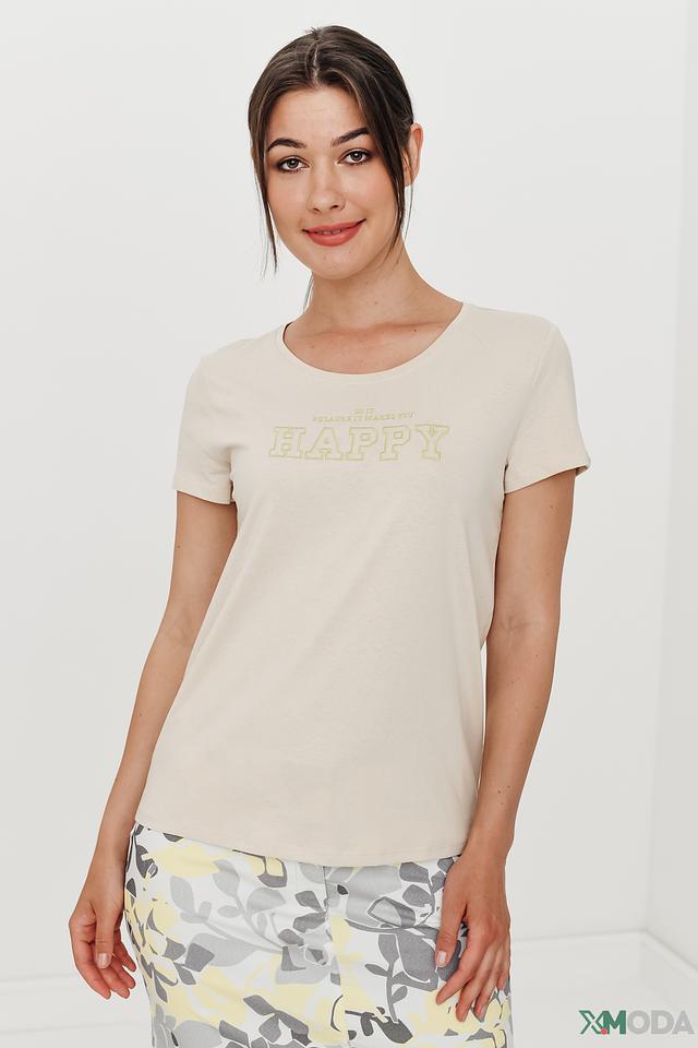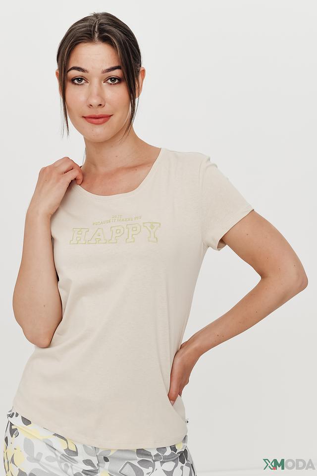 Особый акцент в дизайне этой модели – яркий принт "HAPPY" с надписью и декоративной окантовкой лаймового цвета. Этот принт добавляет футболке игривости и позитива. Футболка идеально подойдет для создания повседневных образов в стиле casual.
