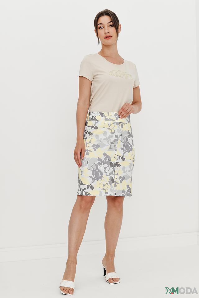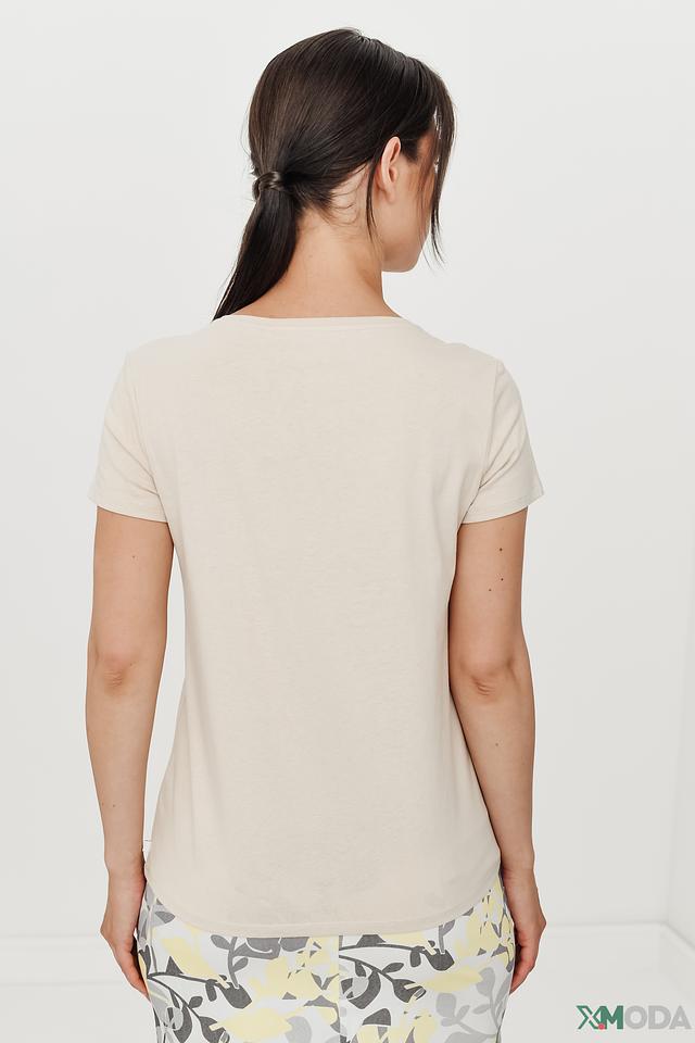 Футболка имеет классический прямой крой, который подходит для любой фигуры. Короткие рукава делают ее идеальным выбором для теплой погоды. Основной цвет футболки – бежевый, что делает ее универсальной и легко сочетаемой с другими элементами одежды.