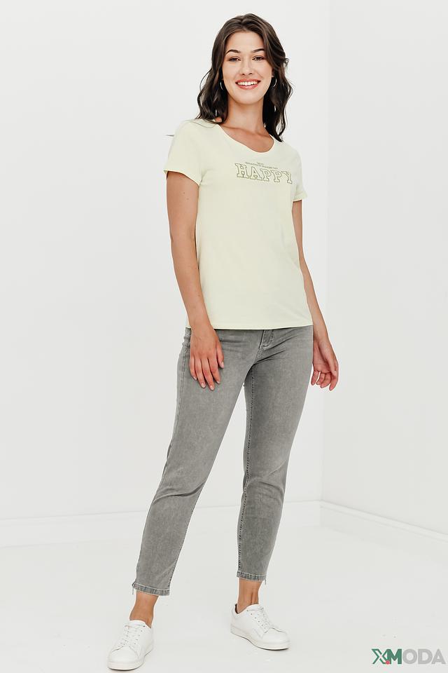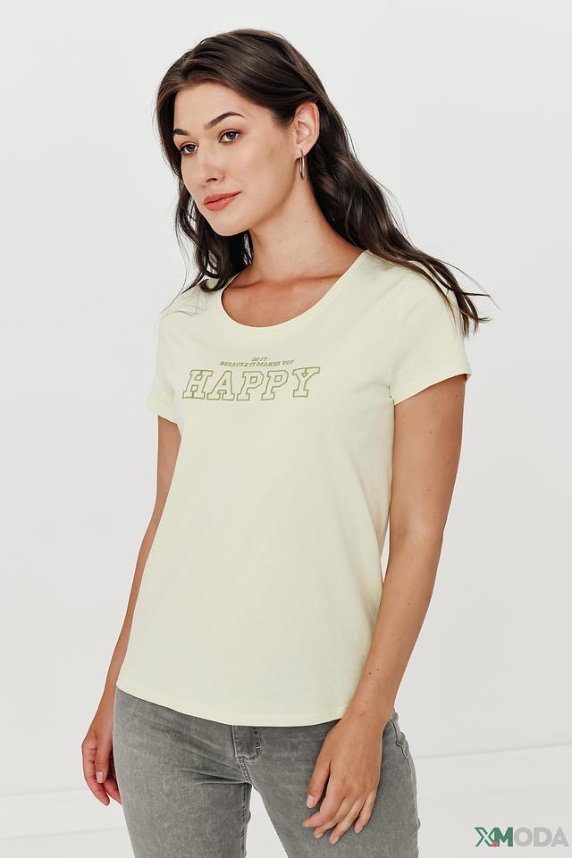 Модель имеет прямой крой и короткие рукава, что обеспечивает свободу движений и комфорт в жаркую погоду. На передней части футболки расположен яркий принт "HAPPY", выполненный в зелёных тонах, который добавит позитива и индивидуальности вашему образу.