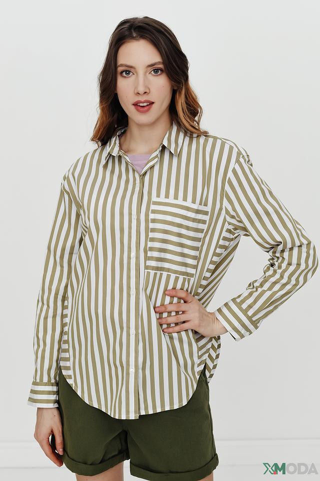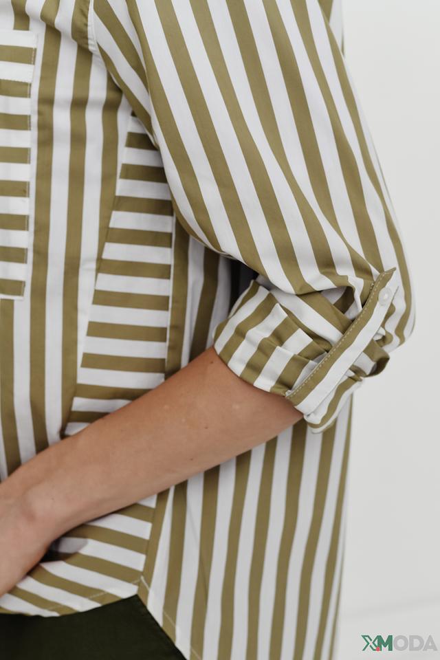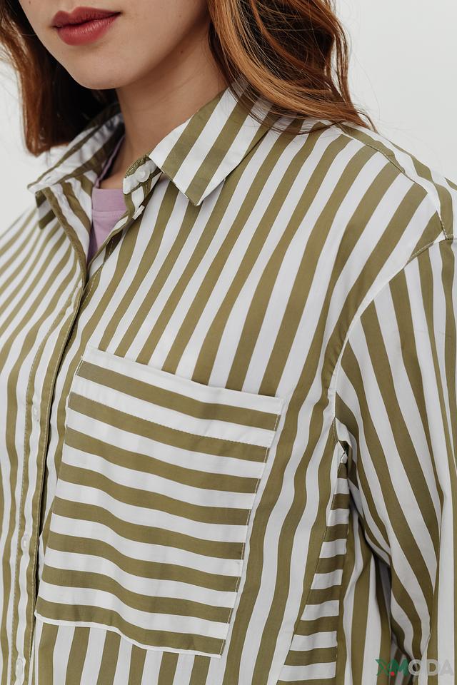 Основной цвет рубашки – сочетание зелёного и белого в вертикальную полоску. На груди расположена накладная деталь в полоску, добавляющая оригинальности дизайну. Рубашка застегивается на пуговицы.
