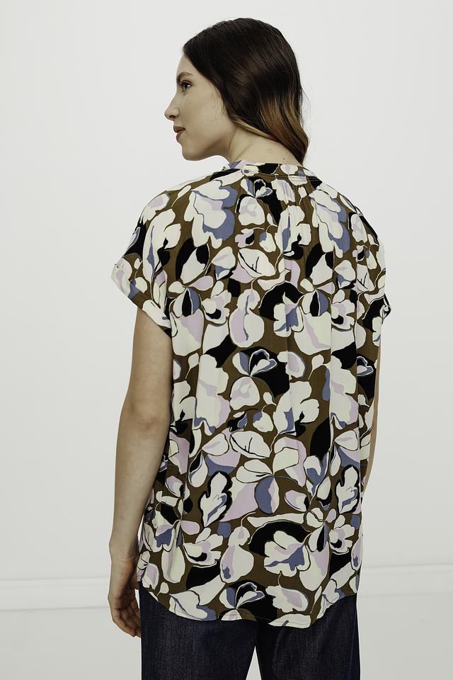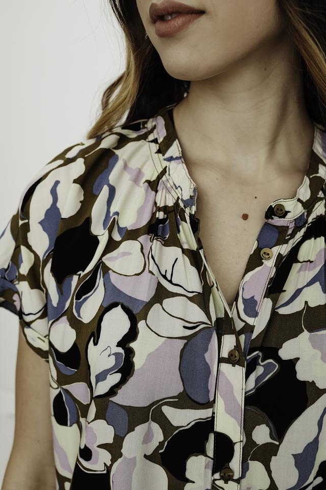Блуза имеет свободный крой, короткие рукава и классический воротник. Особенностью модели является яркий цветочный принт, выполненный в сочетании коричневого, голубого, лавандового и белого цветов.