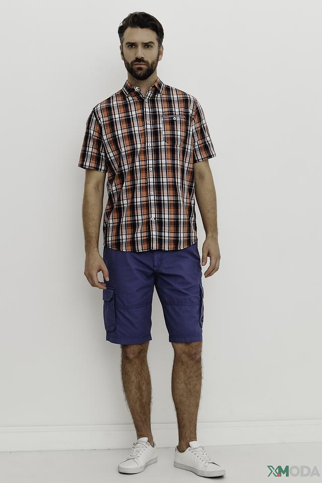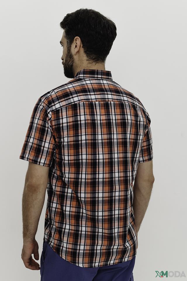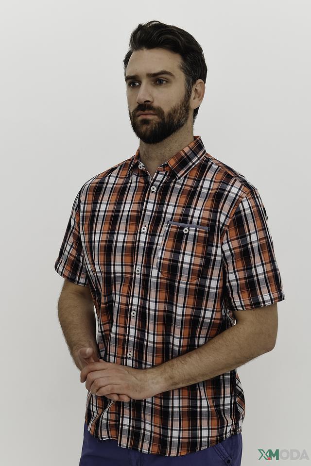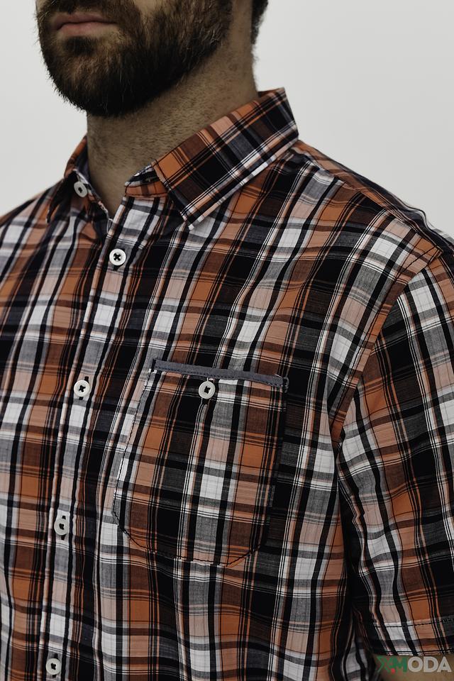 Рубашка выполнена в классическом крое с короткими рукавами и традиционным воротником. Яркий клетчатый принт в оранжево-бело-черной гамме делает эту модель заметной и привлекательной. На груди расположена накладная кармашка с пуговицей.