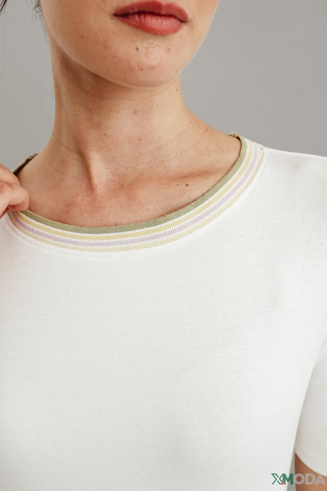 Особенностью данной модели является декоративная полоска у горловины, выполненная в нежных пастельных тонах. Она добавляет образу легкости и свежести.