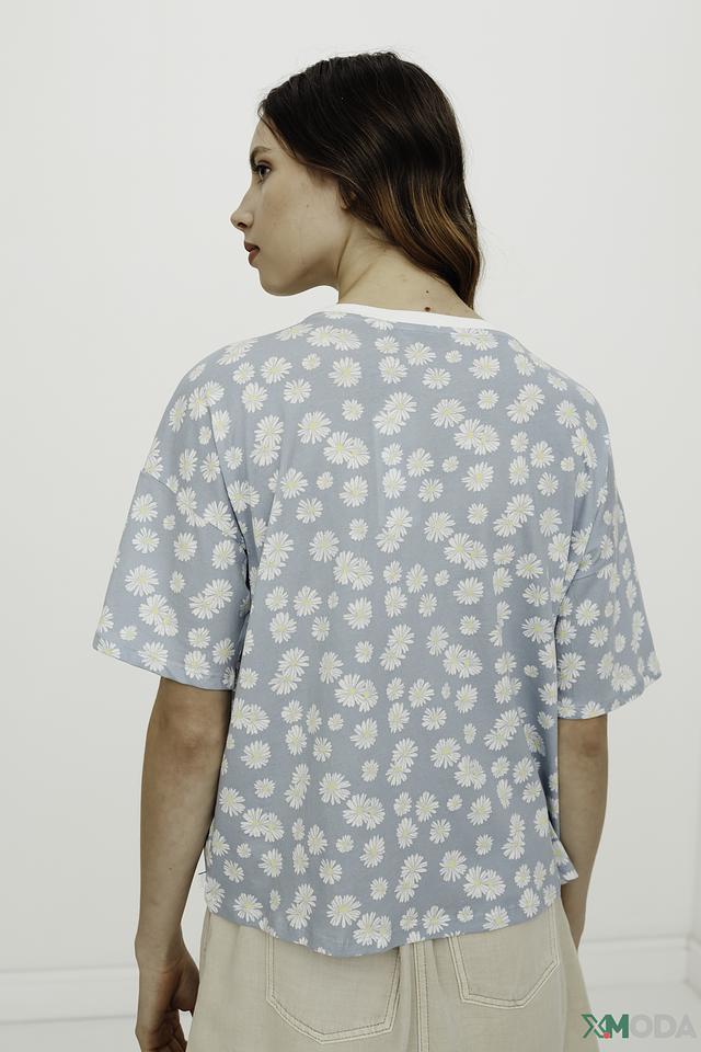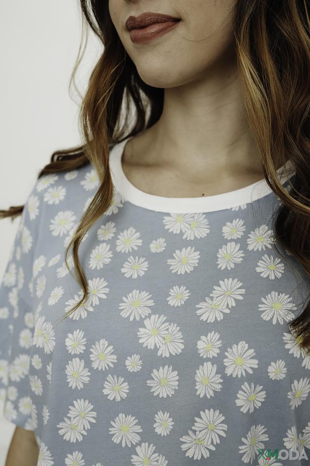 Футболка имеет прямой крой и короткие рукава, что обеспечивает свободу движений. Особенностью модели является яркий принт в виде мелких белых ромашек на голубом фоне, который придает ей свежий и летний вид.