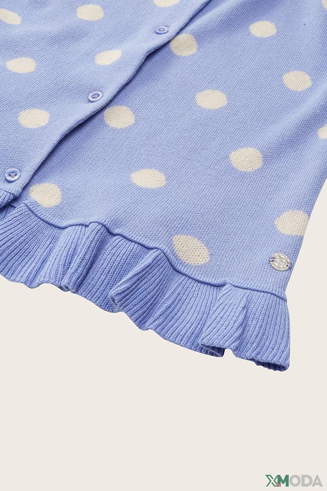 Кардиган имеет нежный голубой цвет, украшенный очаровательным принтом в белый горошек. Классический крой с длинными рукавами и застежкой на пуговицы делает его универсальным и подходящим для различных случаев. Декоративный манжет с рюшами добавляет образу игривости и кокетства.