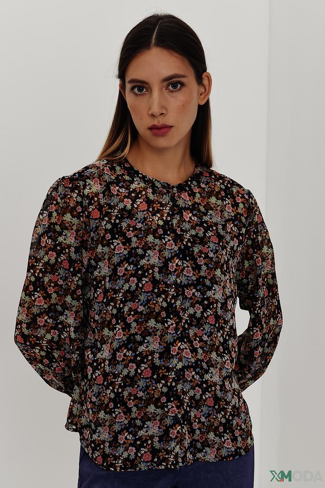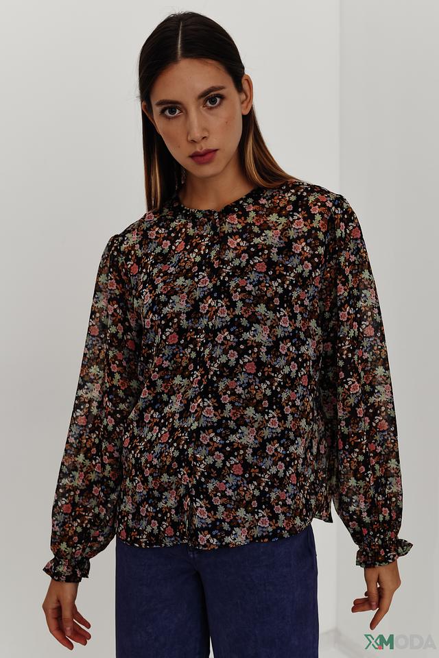 Блуза имеет яркий цветочный принт на черном фоне, который придает ей женственность и очарование. Округлый вырез горловины и рукава с оборками добавляют образу романтичности.