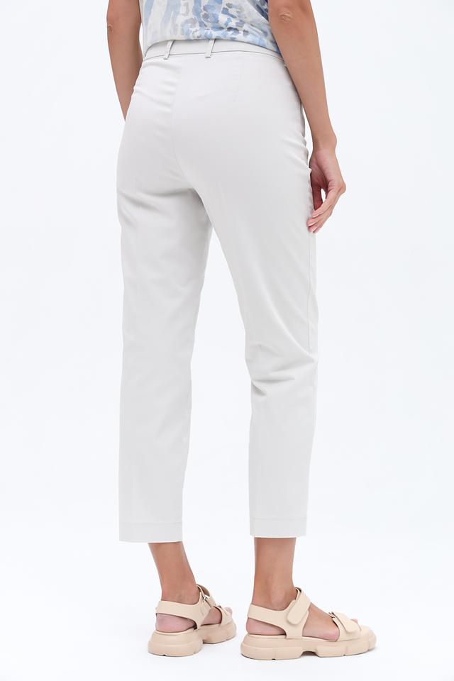 Брюки имеют прямой крой и укороченную длину, что делает их идеальными для создания модных образов в тёплое время года. Классическая посадка на талии и удобный пояс обеспечивают комфортную посадку по фигуре. Материал – сочетание хлопка, полиэстера и эластана – приятен к телу, хорошо держит форму и обеспечивает свободу движений.
