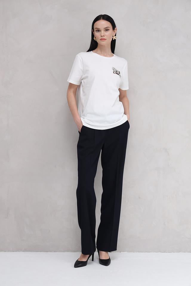 Брюки имеют прямой крой, который обеспечивает комфортную посадку и свободу движений. Высокая посадка визуально удлиняет ноги и подчеркивает талию. Застежка на пуговицу и молнию обеспечивает надежную фиксацию. Модель дополнена боковыми карманами.