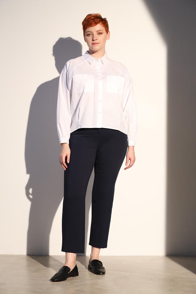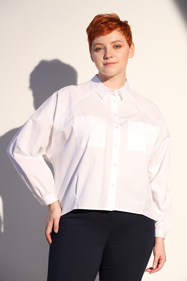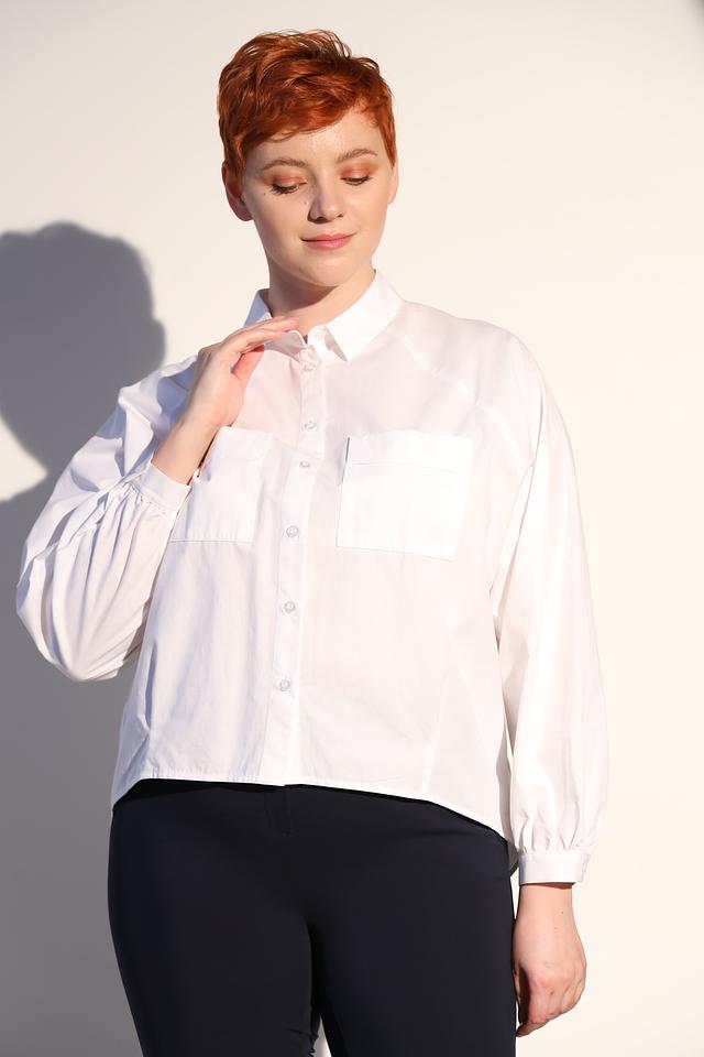 Рубашка имеет прямой крой, длинные рукава с манжетами на пуговицах и отложной воротник. На груди расположены две накладные карманы, добавляющие модели функциональности и стиля.
