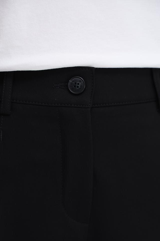 Брюки имеют высокую посадку, прямой крой и слегка зауженный силуэт к низу, что обеспечивает комфортную посадку и визуально удлиняет ноги. На поясе предусмотрена аккуратная застёжка на пуговицу и молнию. Брюки дополнены небольшими складками спереди, придающими им более элегантный вид.