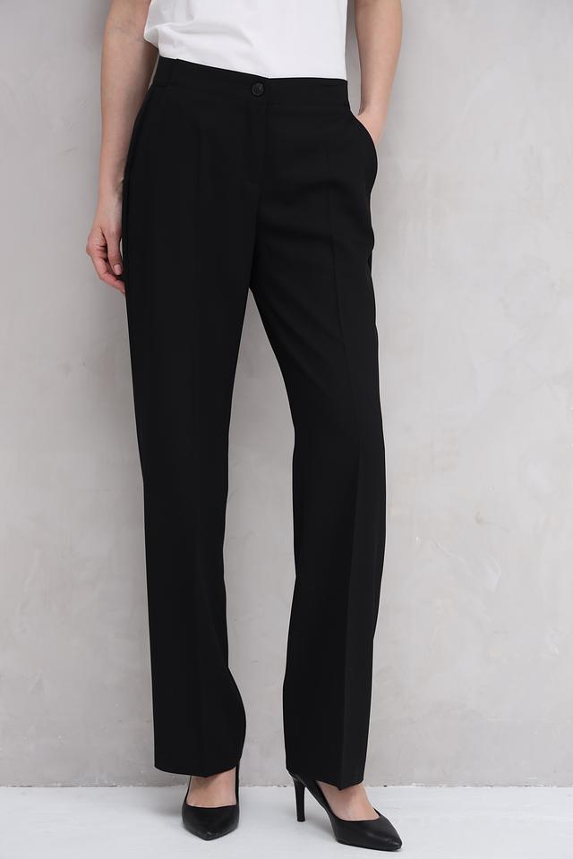Брюки имеют прямой крой и стандартную посадку по талии. Застежка на молнию и пуговицу обеспечивает надежную фиксацию. На брюках предусмотрены боковые карманы. Ткань состоит из 100% полиэстера, что обеспечивает легкость и практичность в уходе.