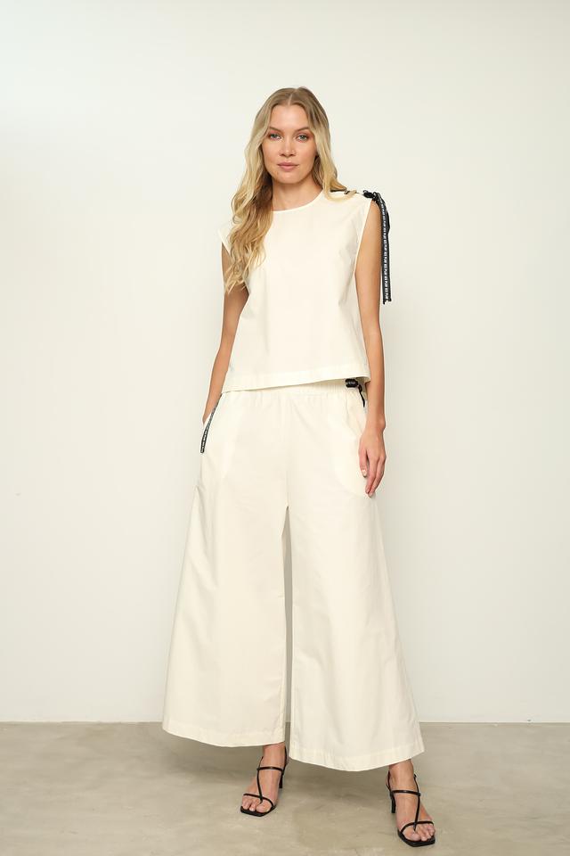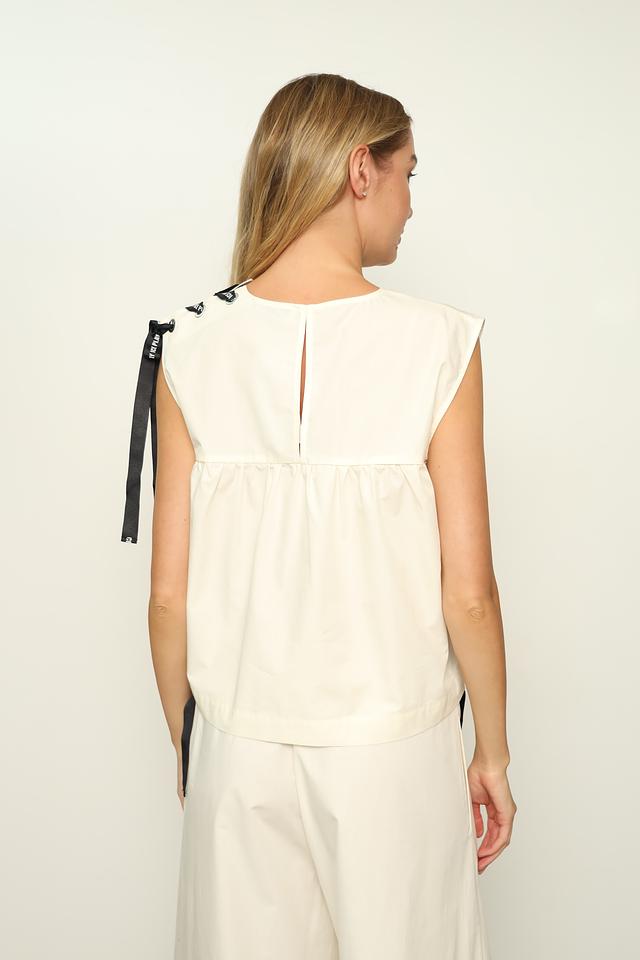 Топ имеет свободный крой и круглый вырез горловины. Отличительной особенностью модели являются декоративные ленты по бокам и на плечах, которые придают ей оригинальность и спортивный вид. Ленты выполнены в чёрно-белой гамме с логотипом бренда.