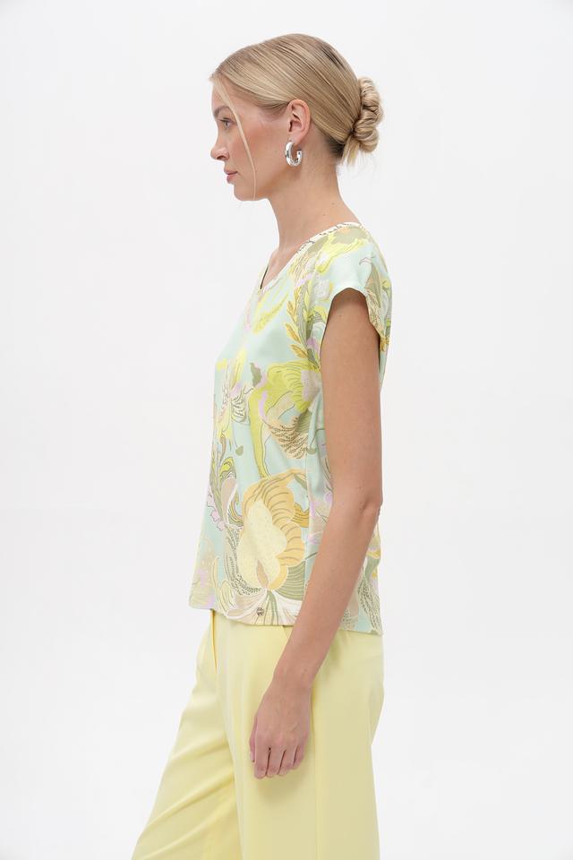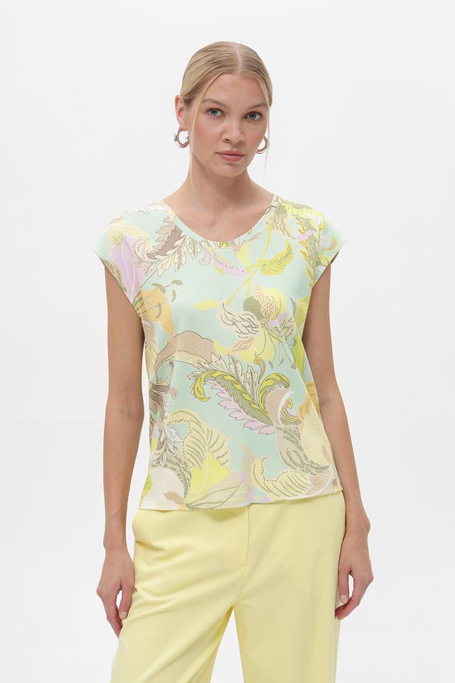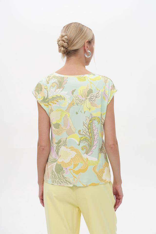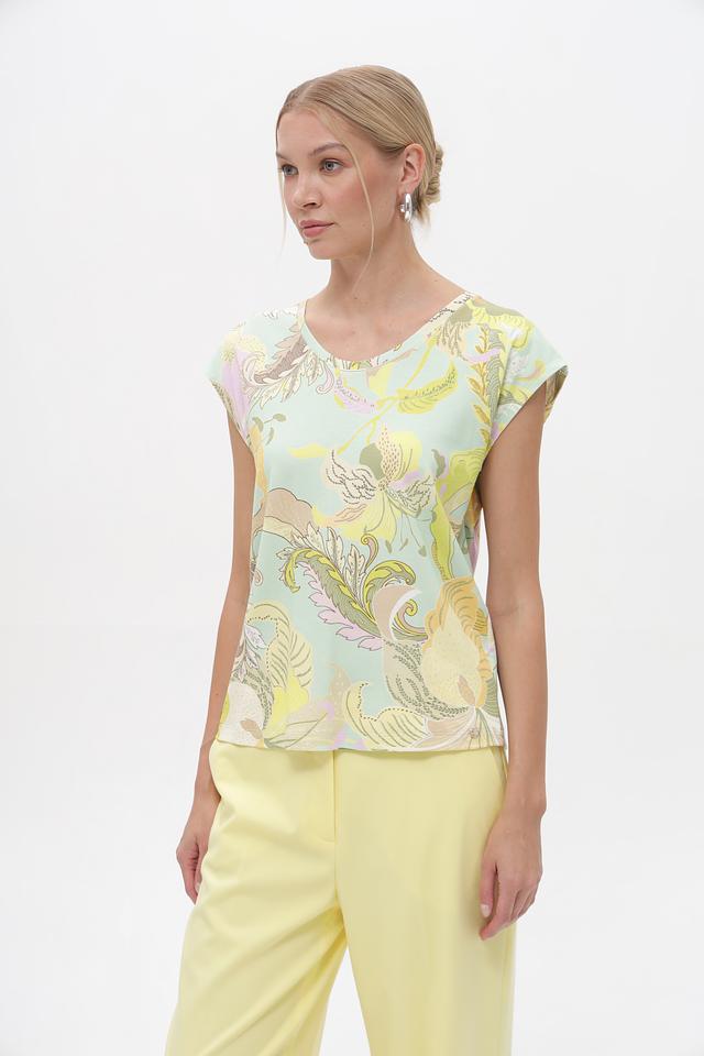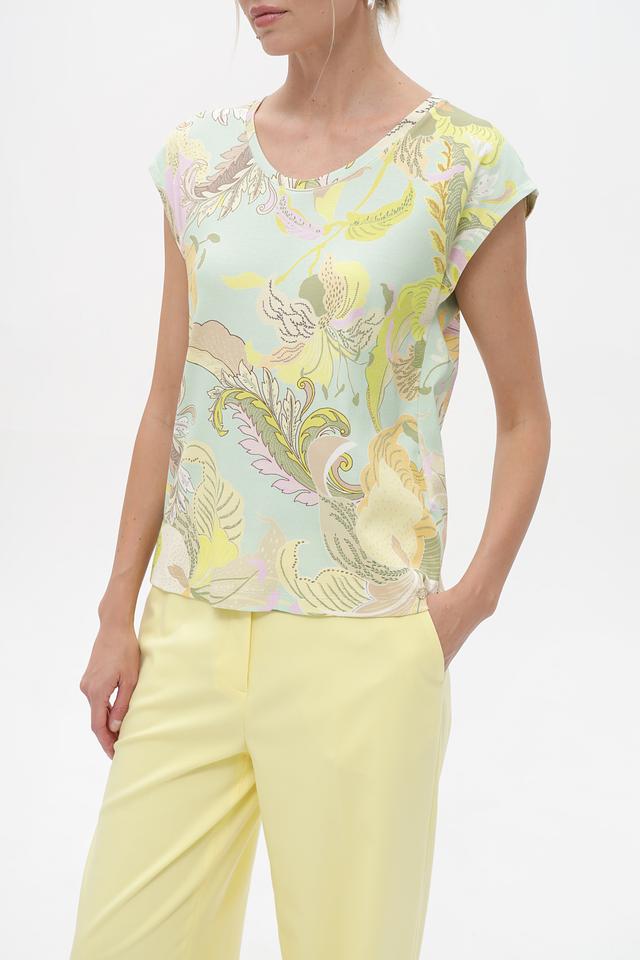 Женский топ Marc Cain мятного цвета с ярким цветочным принтом. Изготовлен из мягкого хлопка с добавлением эластана для комфортной посадки и свободы движений. Состав: хлопок 94%, эластан 6%
