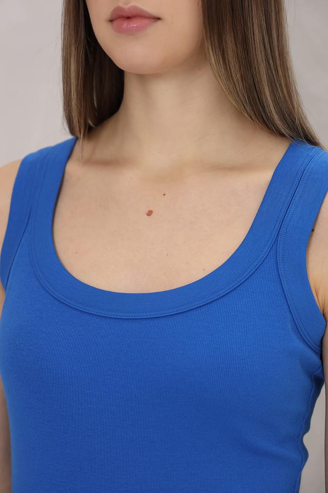 Яркий синий цвет топа делает его акцентным элементом образа. Он прекрасно сочетается с джинсами, брюками и юбками различных фасонов. Топ идеально подходит для создания как повседневных, так и более нарядных образов.
