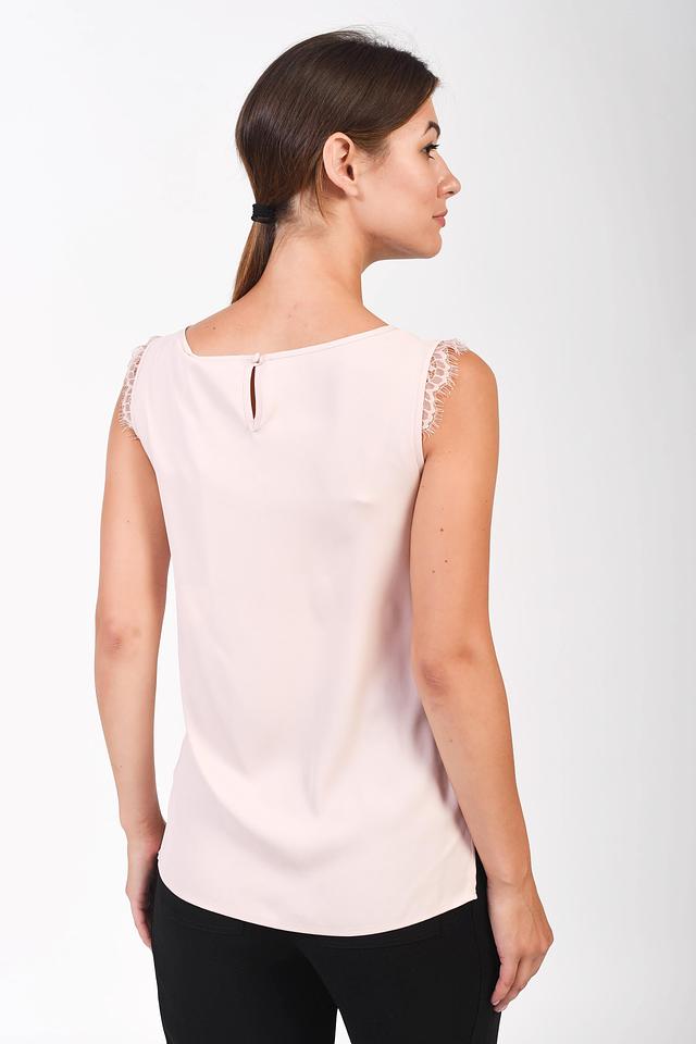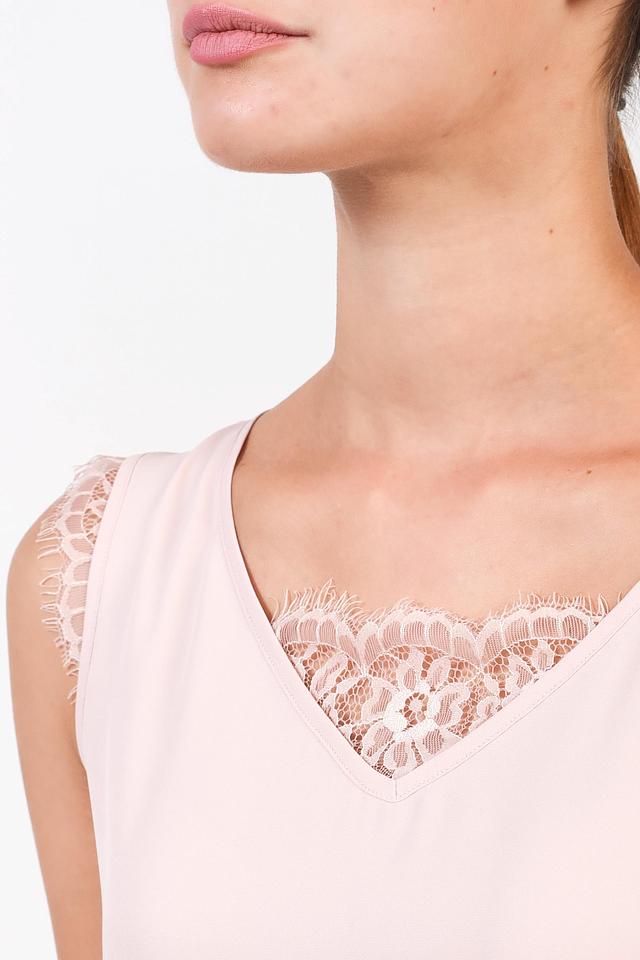 Особенностью данной модели является V-образный вырез горловины, украшенный изысканным кружевом. Кружево также присутствует на плечах, добавляя образу женственности и элегантности. Топ выполнен из 100% полиэстера, что обеспечивает легкость и простоту в уходе.