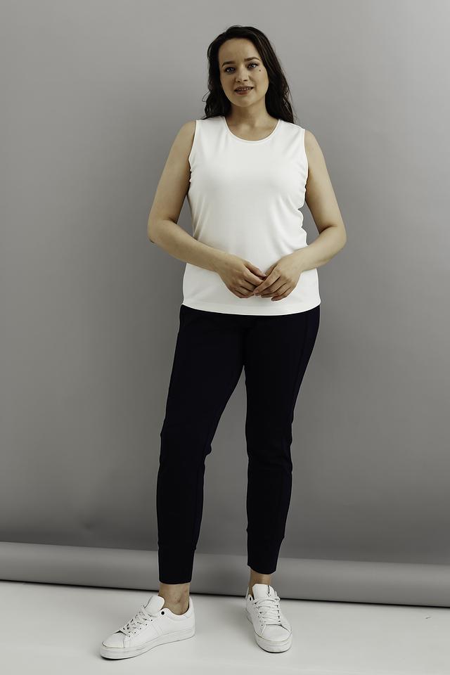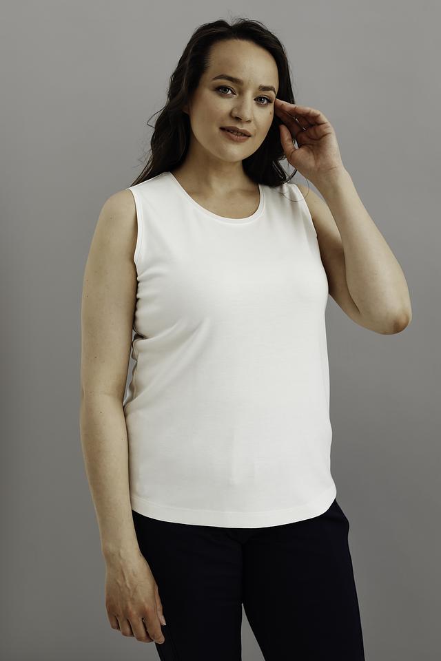 Топ имеет прямой крой и круглый вырез горловины. Отсутствие рукавов делает его идеальным выбором для тёплой погоды или для ношения под жакет или кардиган.