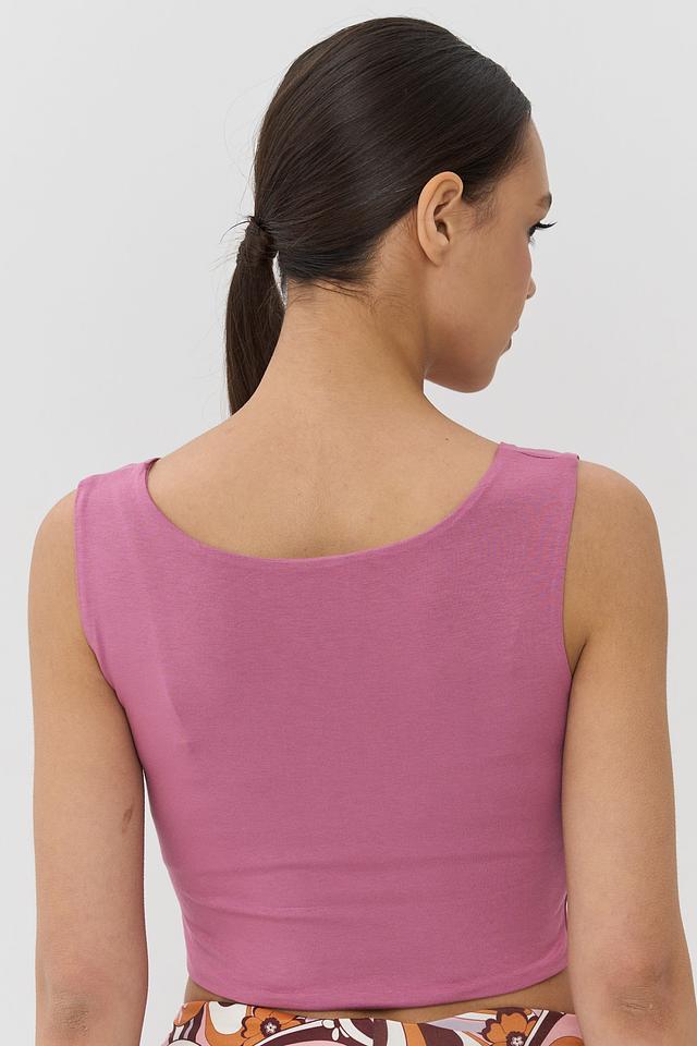 Топ имеет квадратный вырез и тонкие бретельки, что придает ему женственность и легкость. Благодаря составу из вискозы и эластана, он приятен к телу, хорошо тянется и не сковывает движений.