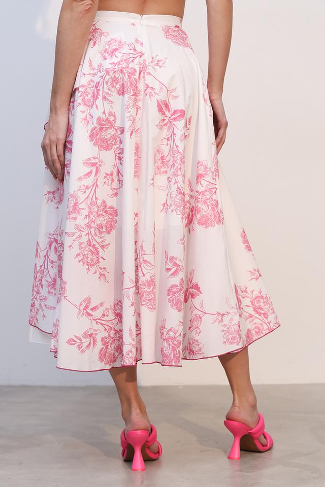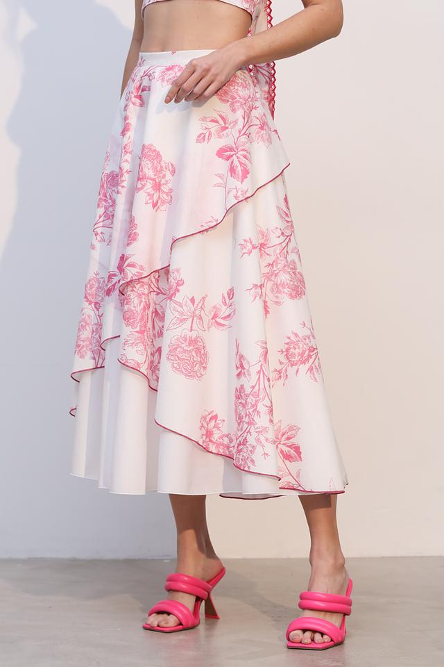 Юбка имеет нежно-розовый цвет и украшена ярким цветочным принтом, который придает ей особую изысканность. Асимметричный крой и многослойный дизайн создают эффект легкости и динамики.