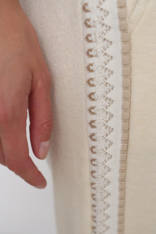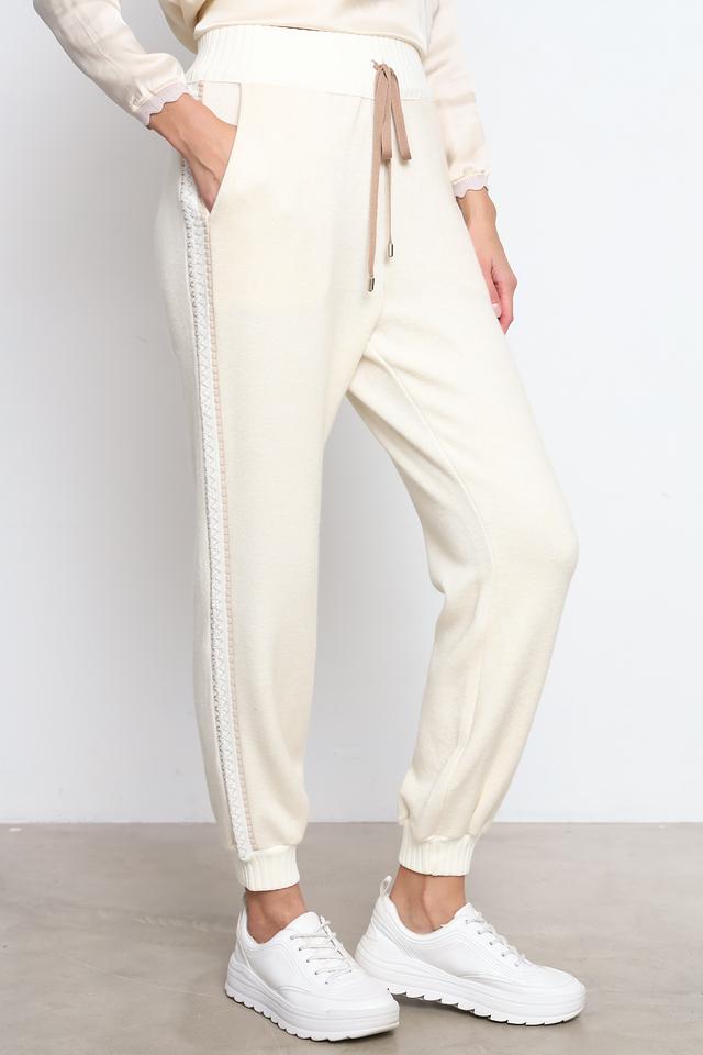 Брюки отличаются наличием декоративной отделки в виде ажурного плетения вдоль боковой части штанин, что придает им особый шарм и изысканность. Эластичный пояс с кулиской позволяет регулировать посадку по фигуре.