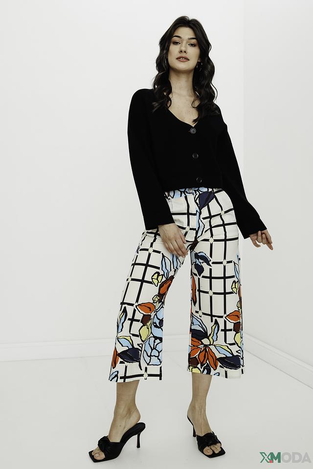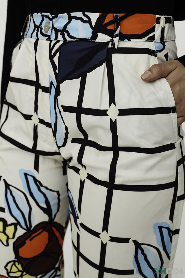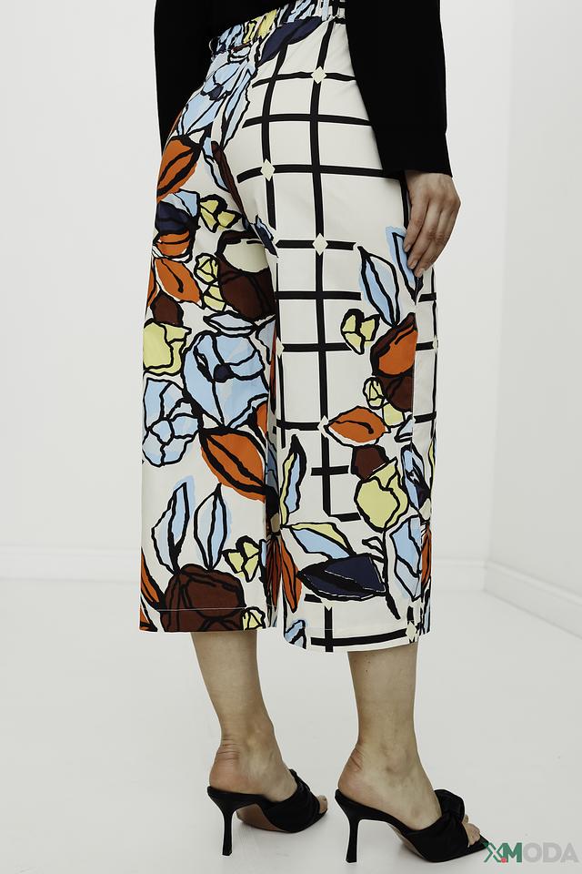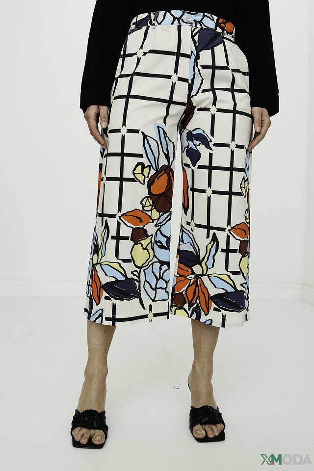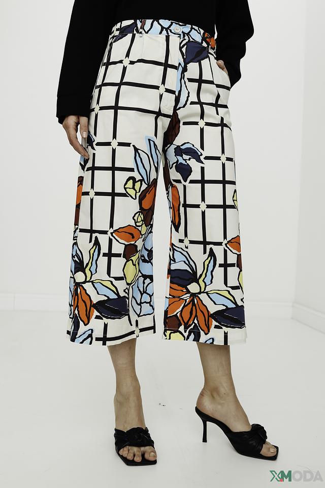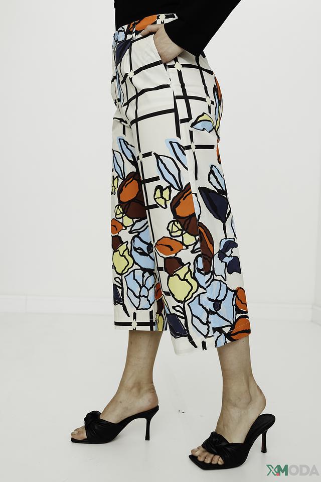 Эти брюки от Tricot Chic станут ярким акцентом вашего гардероба. Модель выполнена в белом цвете и украшена эффектным цветочным принтом, сочетающим в себе оттенки синего, оранжевого, красного и жёлтого.