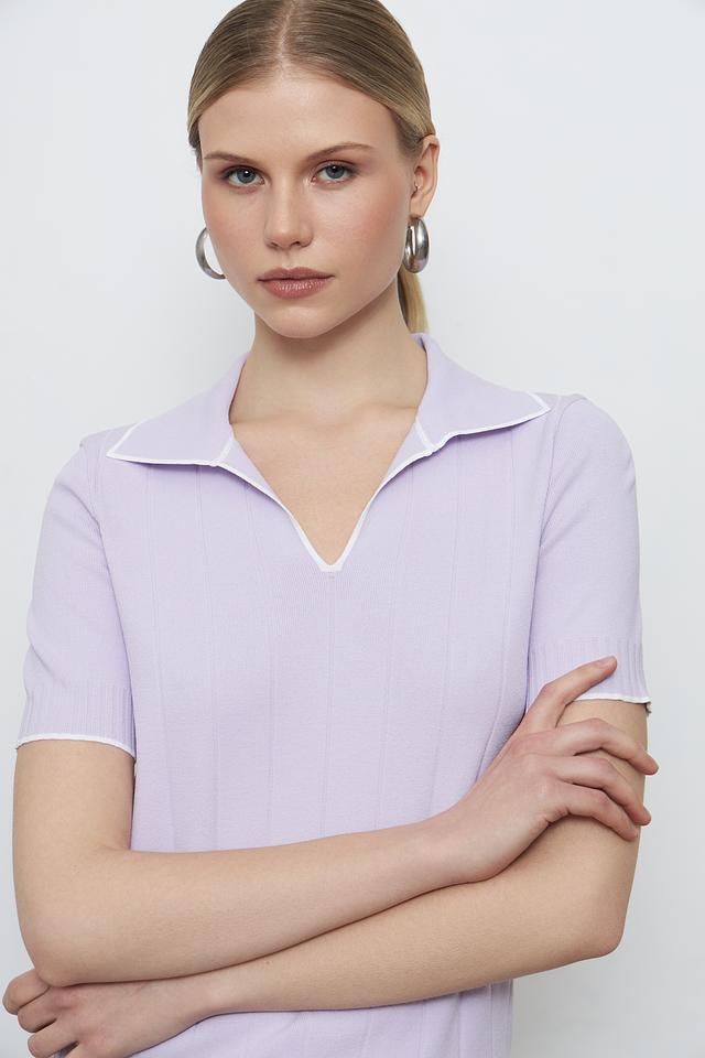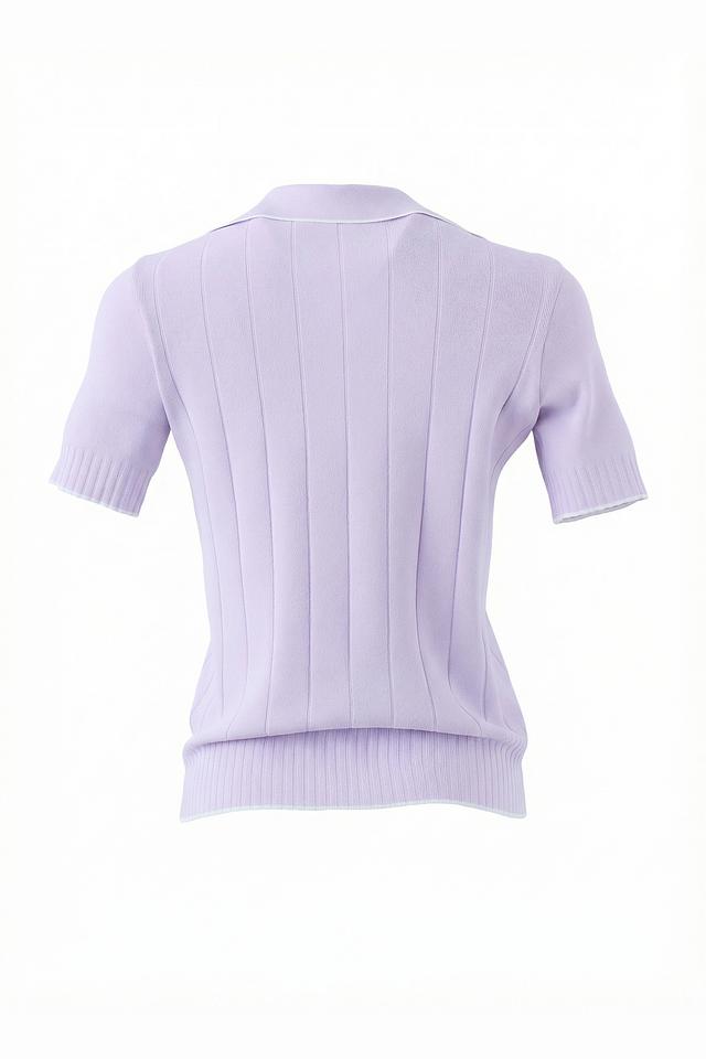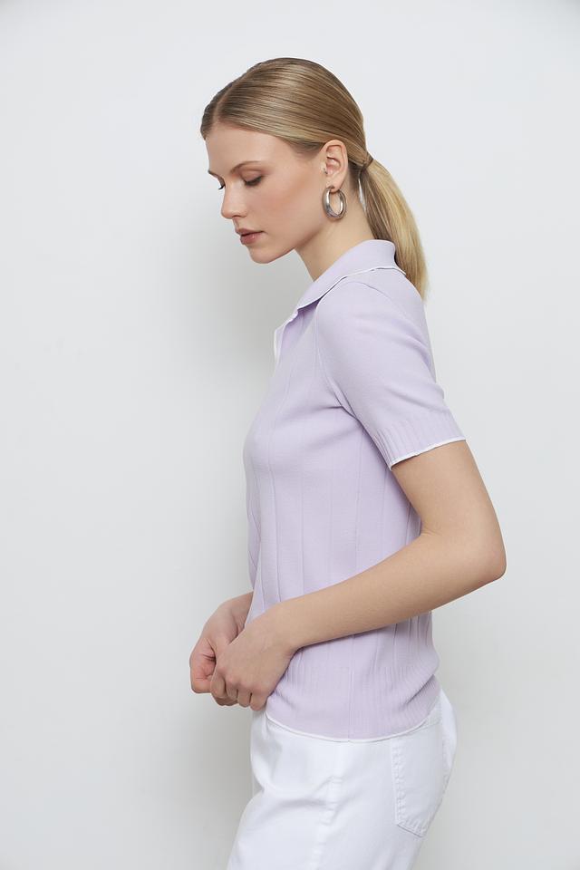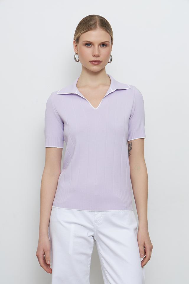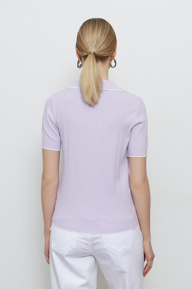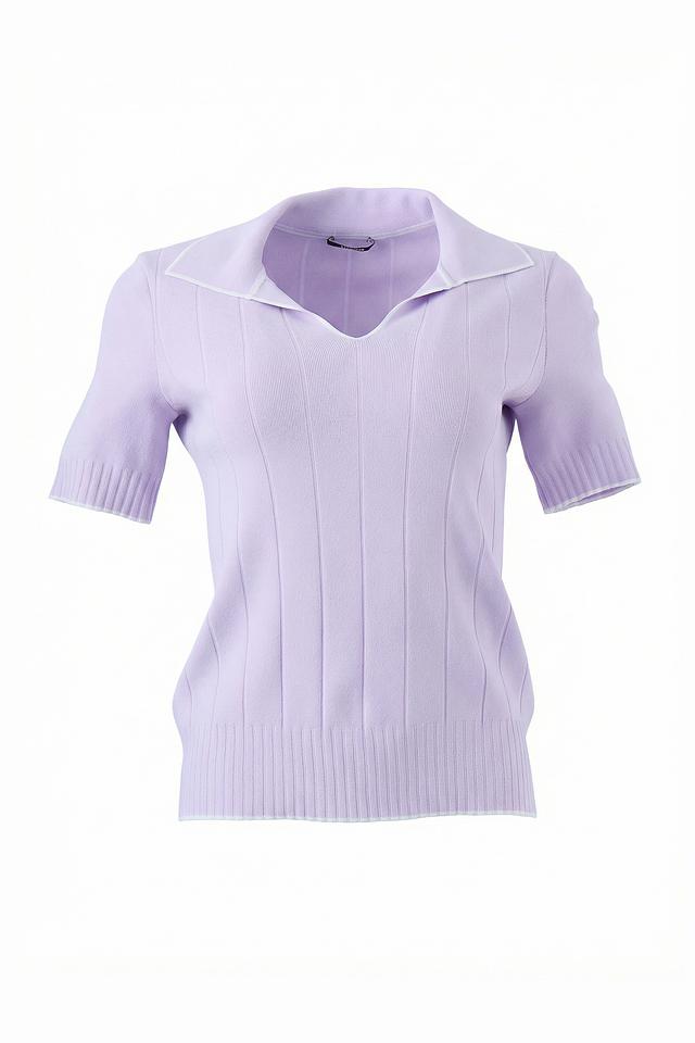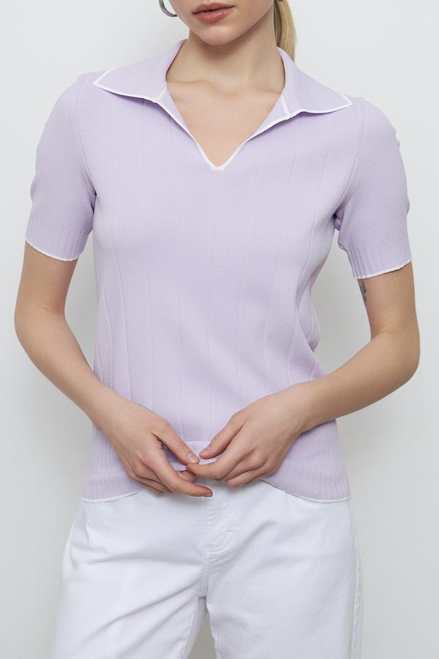 Женский джемпер Tricotier лавандового цвета с короткими рукавами и воротником-поло. Модель выполнена из тонкой вязки и имеет приталенный силуэт, что делает ее универсальным элементом гардероба. Состав: см. на вшивном ярлыке 0%
