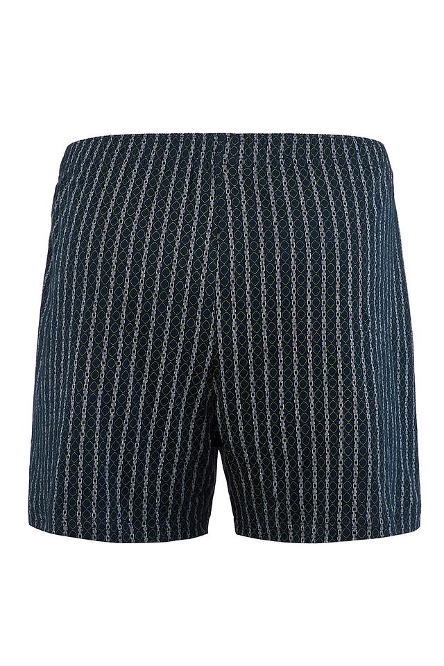 Данная модель выполнена в тёмно-синем цвете и украшена геометрическим принтом в виде полоски. Такой рисунок придаёт трусам современный и динамичный вид. Классический крой обеспечивает удобную посадку по фигуре.