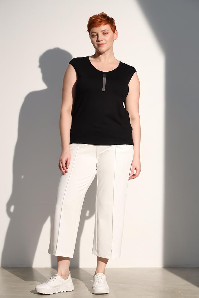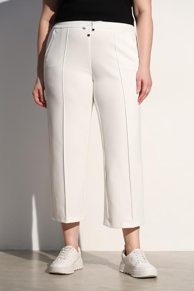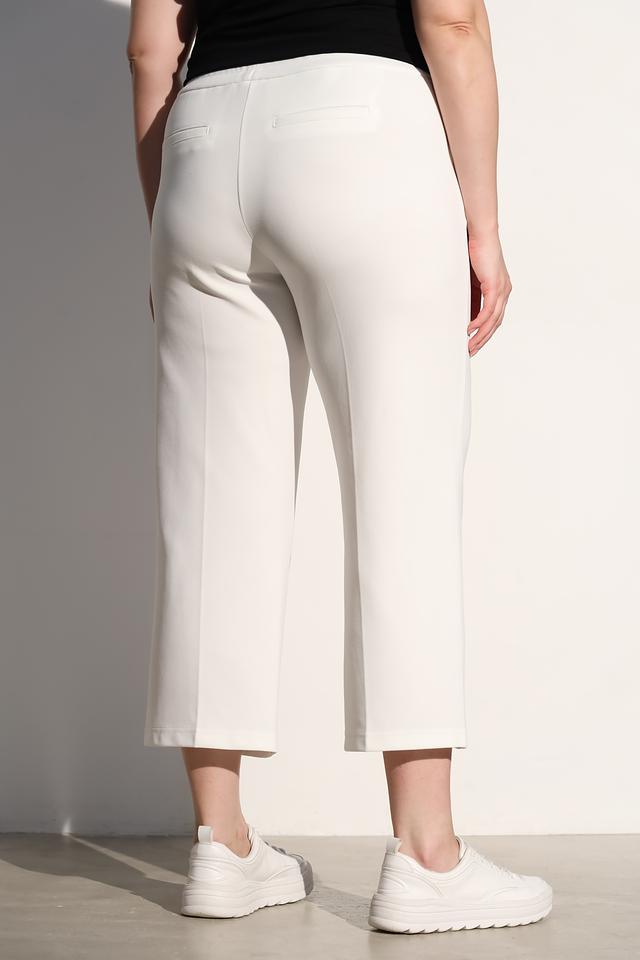 Брюки имеют прямой крой и укороченную длину, что делает их актуальными и модными. Эластичный пояс с завязками обеспечивает комфортную посадку по фигуре. Вертикальные вытачки спереди визуально удлиняют ноги и придают силуэту стройность.