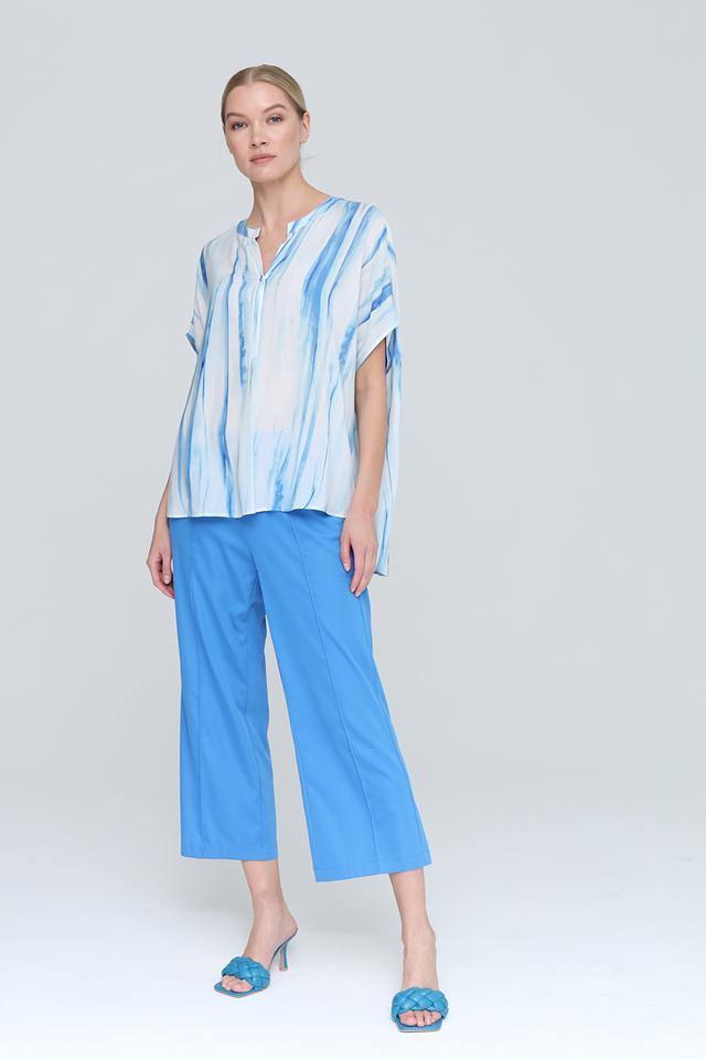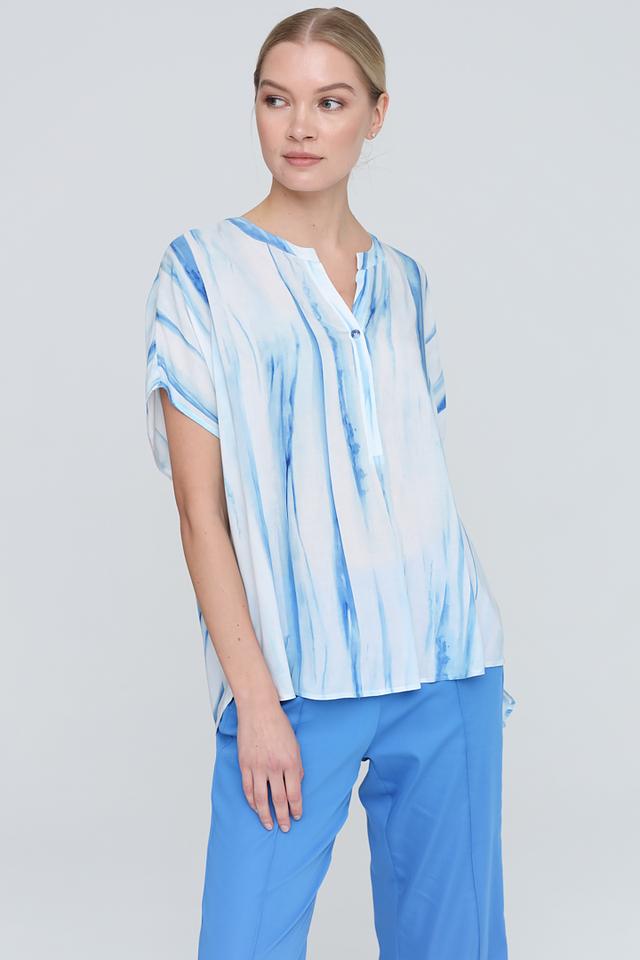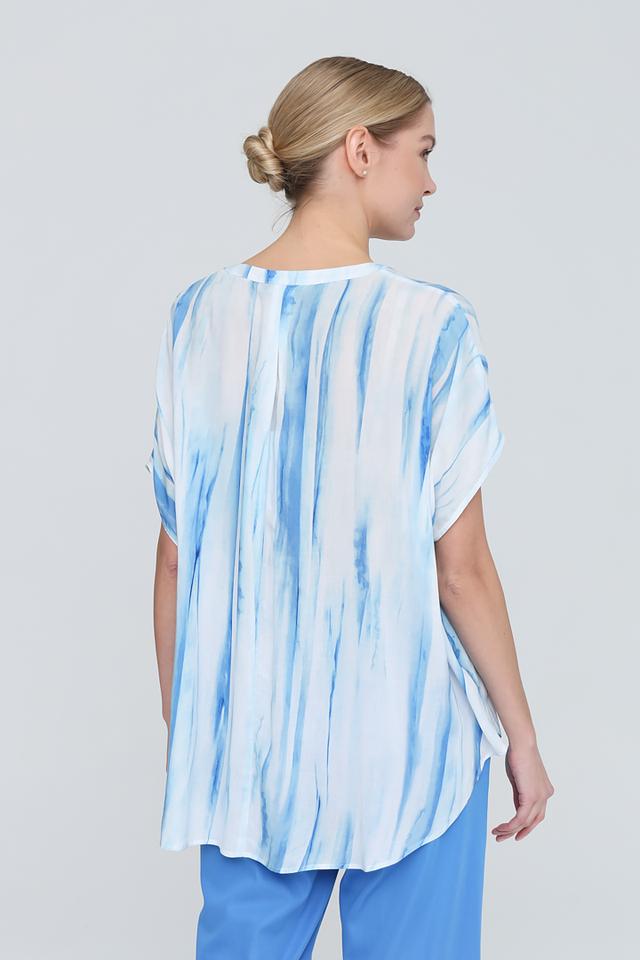 Особенностью модели является оригинальный принт, имитирующий голубой мрамор. Свободный крой не сковывает движений и обеспечивает комфорт в течение всего дня. V-образный вырез горловины и короткие рукава делают блузу идеальным выбором для тёплой погоды.