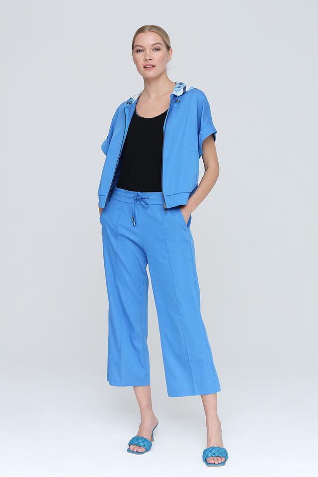 Брюки имеют прямой крой и укороченную длину, что делает их идеальным выбором для теплого времени года. Эластичный пояс с кулиской обеспечивает комфортную посадку по фигуре, а вертикальные вытачки визуально вытягивают силуэт.