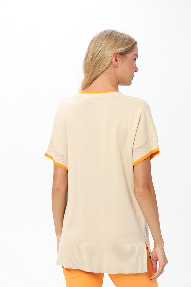 Пуловер имеет V-образный вырез и короткие рукава, что делает его идеальным выбором для теплой погоды. Асимметричный низ добавляет образу оригинальности.