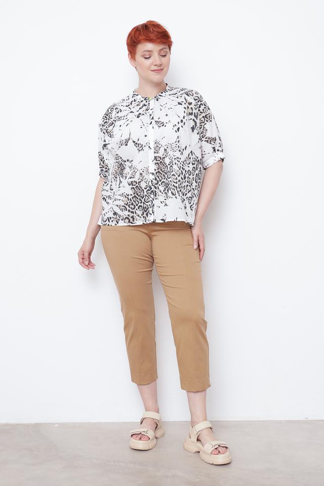 Блуза имеет свободный крой, короткие рукава и воротник с небольшим вырезом и завязками. Привлекает внимание оригинальный принт, имитирующий леопардовую расцветку в белых и серых тонах. Застежка выполнена на пуговицы.