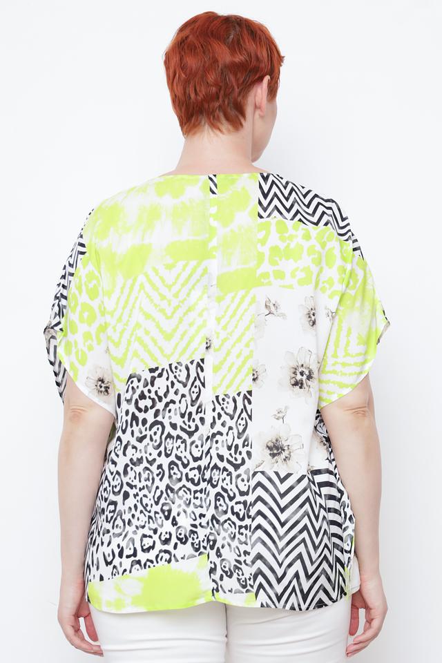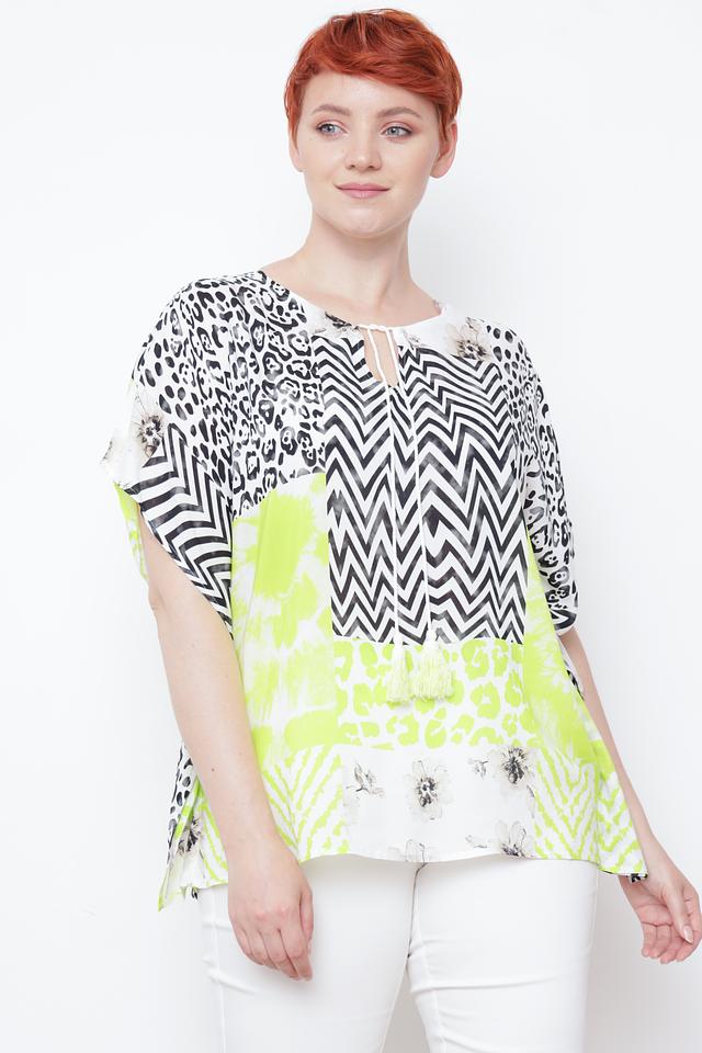 Особенностью данной блузы является ее уникальный принт, сочетающий в себе геометрические узоры, анималистические мотивы и цветочные элементы. Преобладающие цвета – белый, черный, лайм и серый. Рукава 3/4 делают эту блузу универсальной для любого времени года.