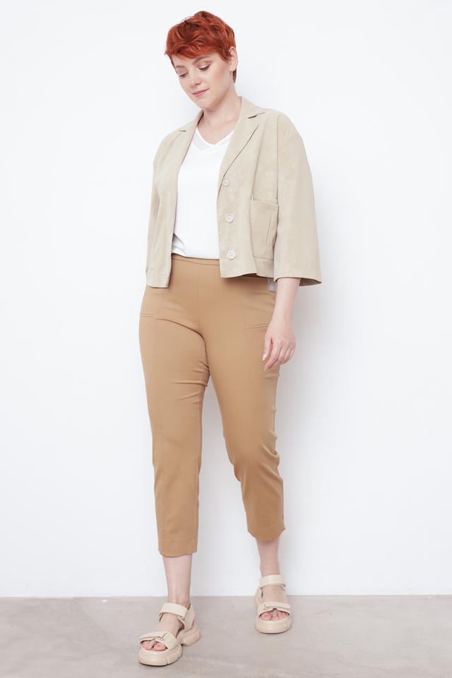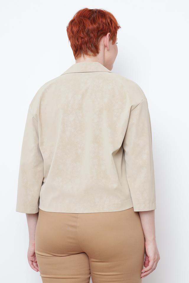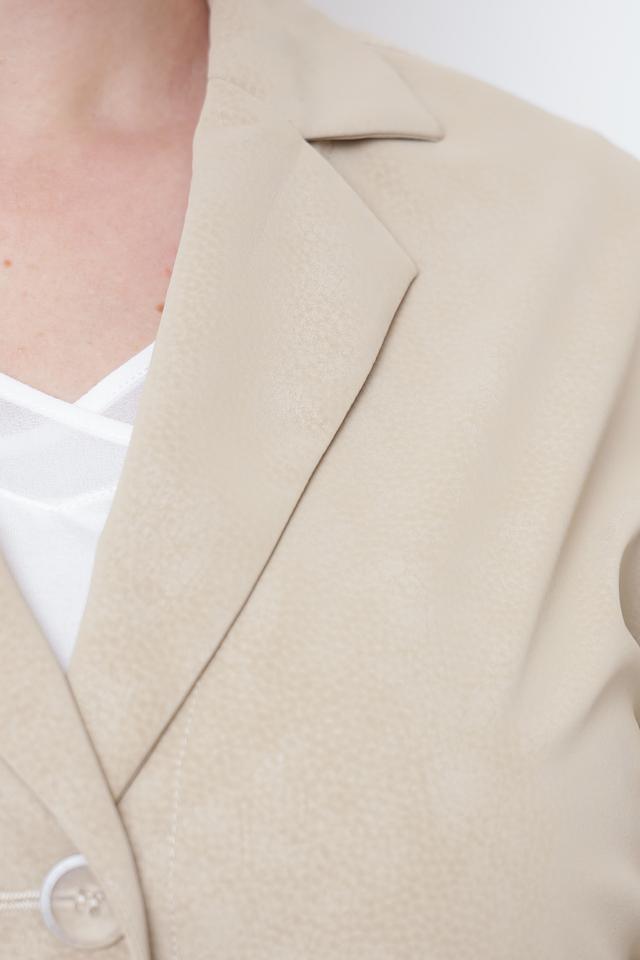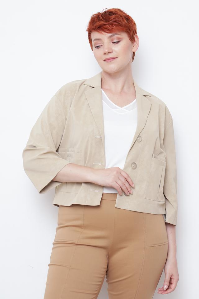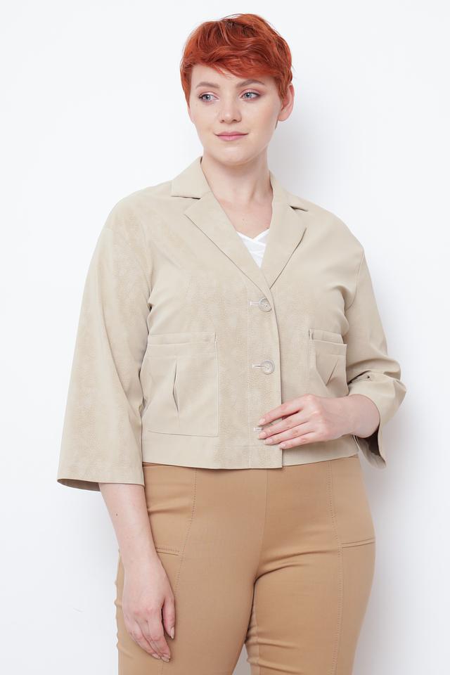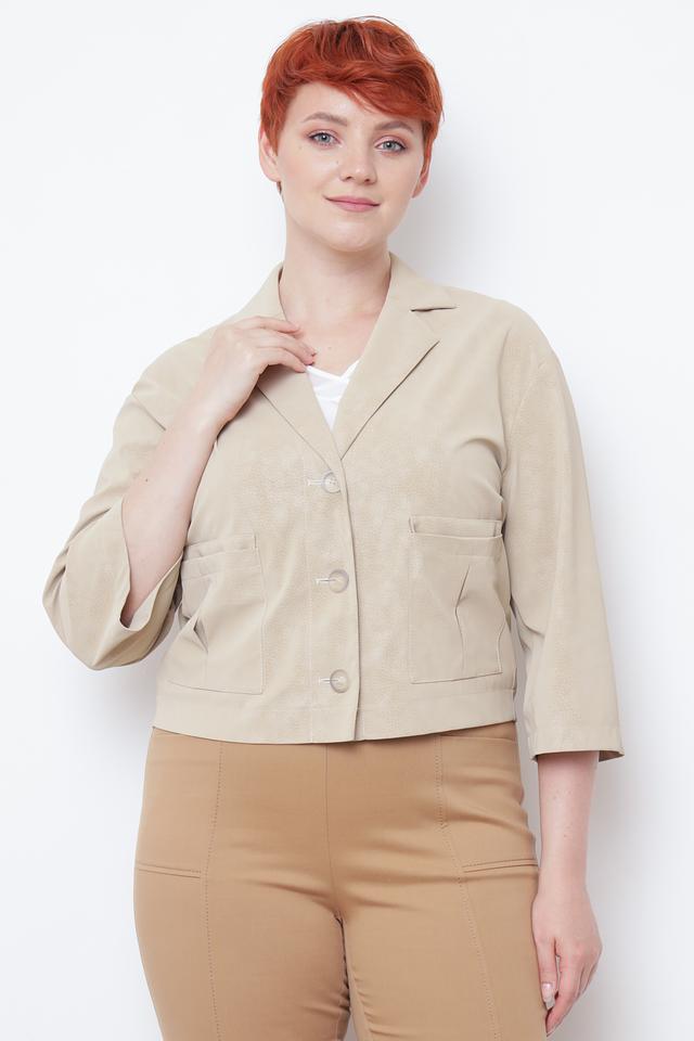 Жакет имеет укороченный крой и ¾ рукава, что делает его актуальным и модным. Застежка на пуговицы обеспечивает удобство и позволяет регулировать посадку по фигуре. Модель дополнена двумя накладными карманами.