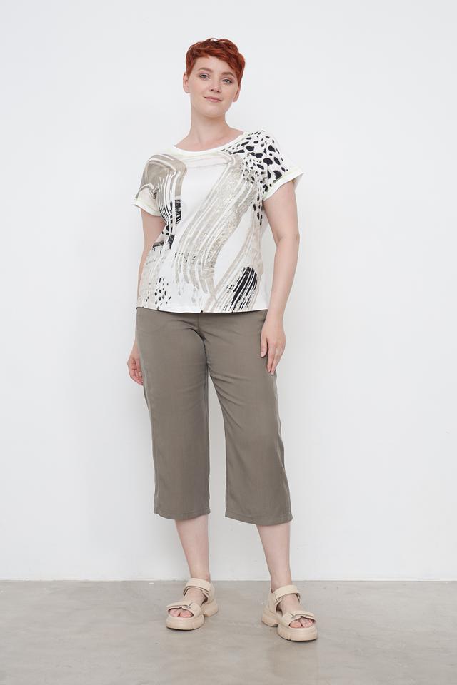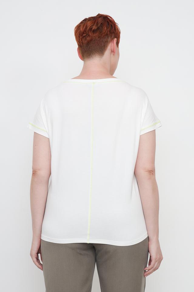 Модель имеет прямой крой и короткие рукава. Вырез горловины округлый, с отделкой тонкой тесьмой светло-зеленого цвета. Футболка изготовлена из высококачественного трикотажа, в состав которого входит 48% хлопка, 47% модала и 5% эластана. Такое сочетание материалов обеспечивает комфорт в носке, мягкость и хорошую посадку по фигуре.