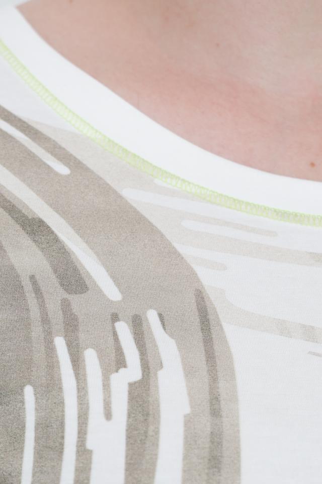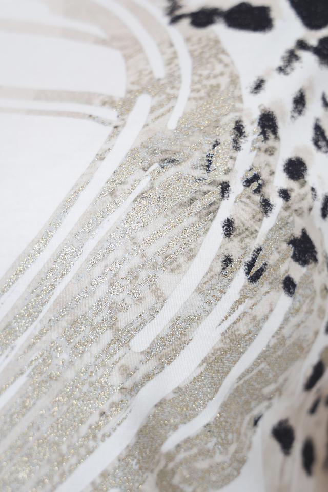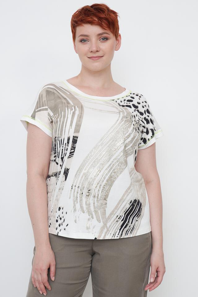 Белая футболка Tuzzi с оригинальным принтом в виде мазков. Модель выполнена из мягкого и приятного к телу сочетания хлопка, модала и эластана, обеспечивающего комфортную посадку. Отличный выбор для создания стильного повседневного образа. Состав: хлопок 48%, модал 47%, эластан 5%