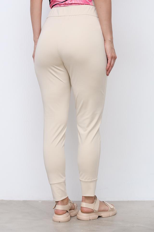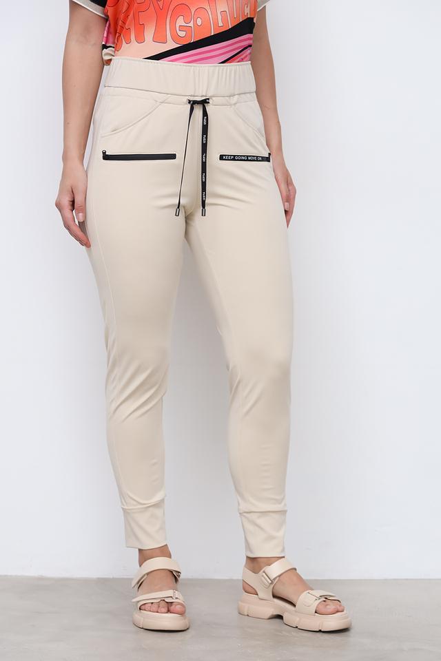 Брюки имеют удобную посадку благодаря эластичному поясу на талии и манжетам внизу штанин. Боковые карманы обеспечивают практичность и функциональность. На левом кармане имеется декоративная черная вставка с надписью “KEEP GOING MOVE ON”.