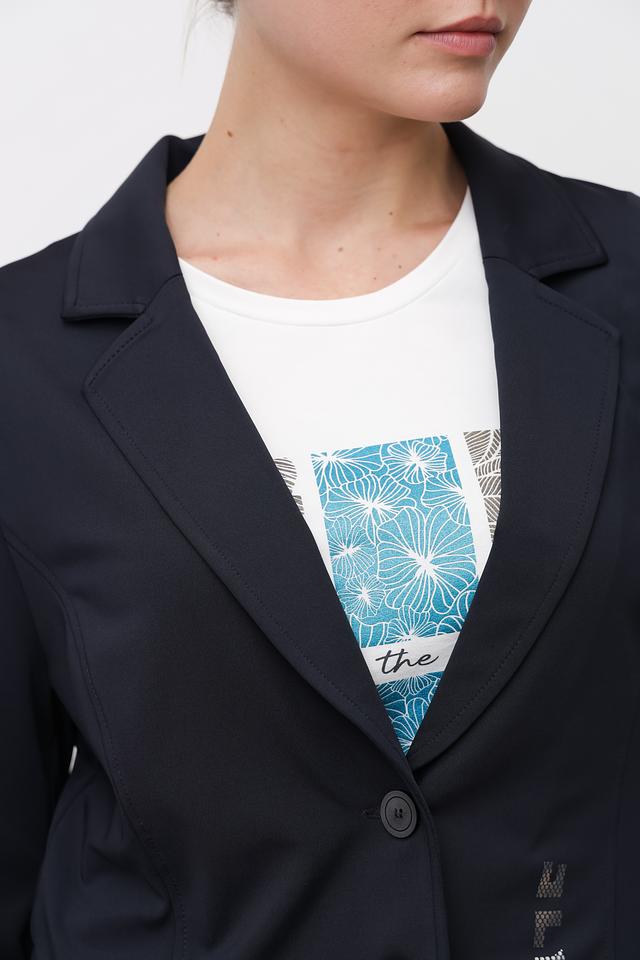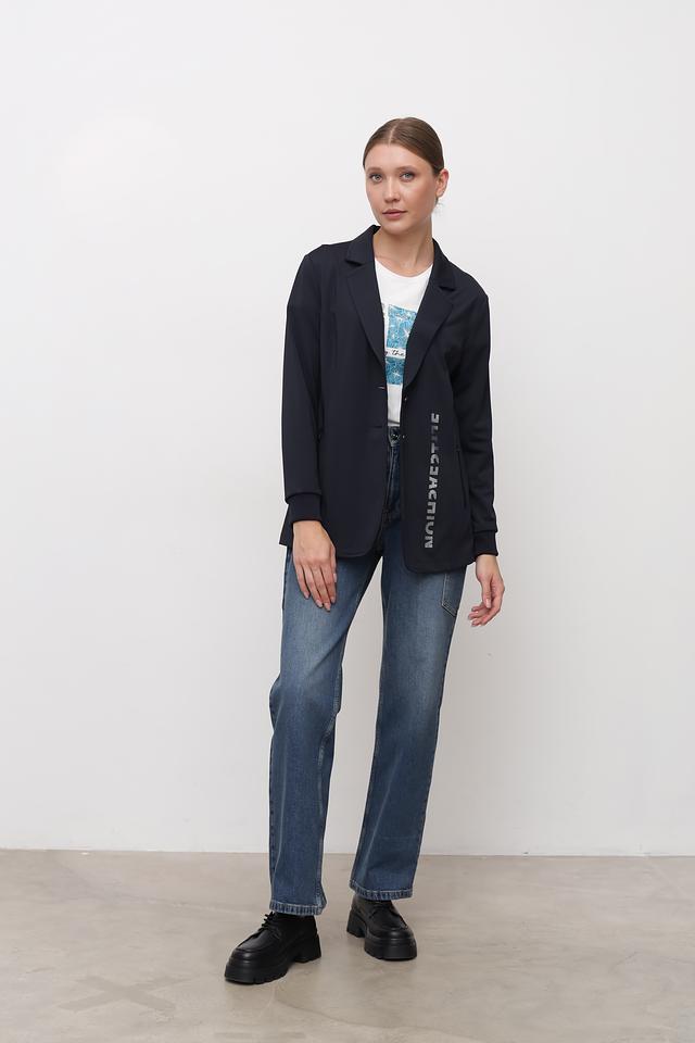 Жакет Tuzzi темно-синего цвета – стильная и современная модель с оригинальной надписью на рукаве. Прямой крой и лаконичный дизайн делают его универсальным дополнением к любому образу. Состав: полиэстер 94%, эластан 6%