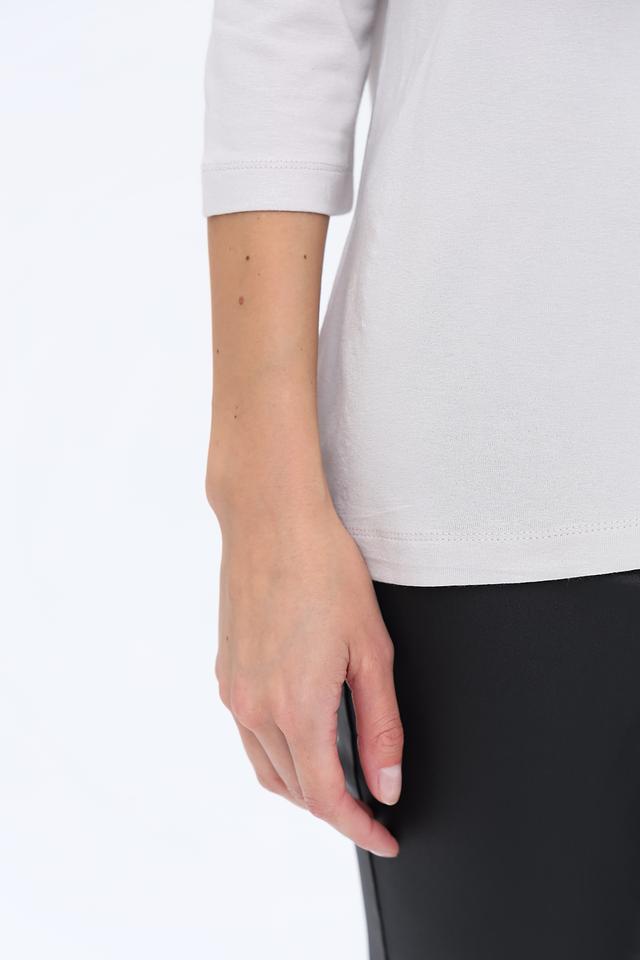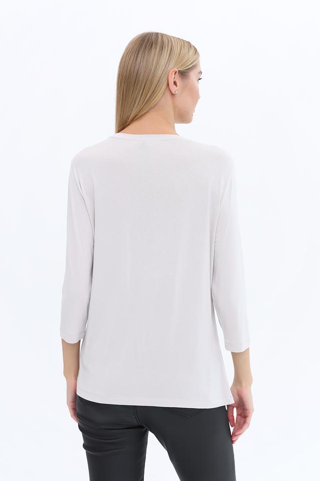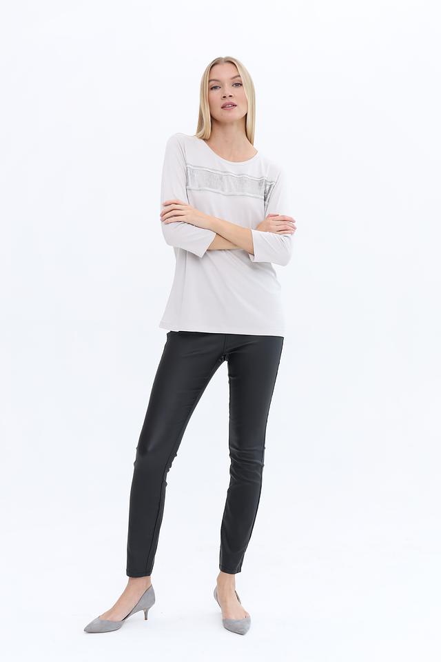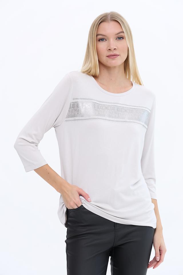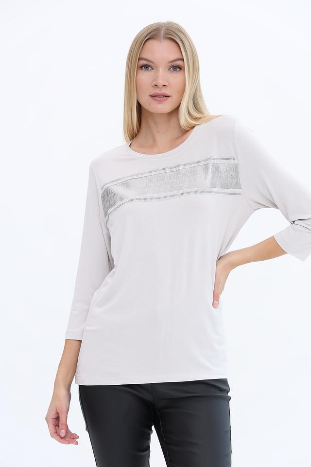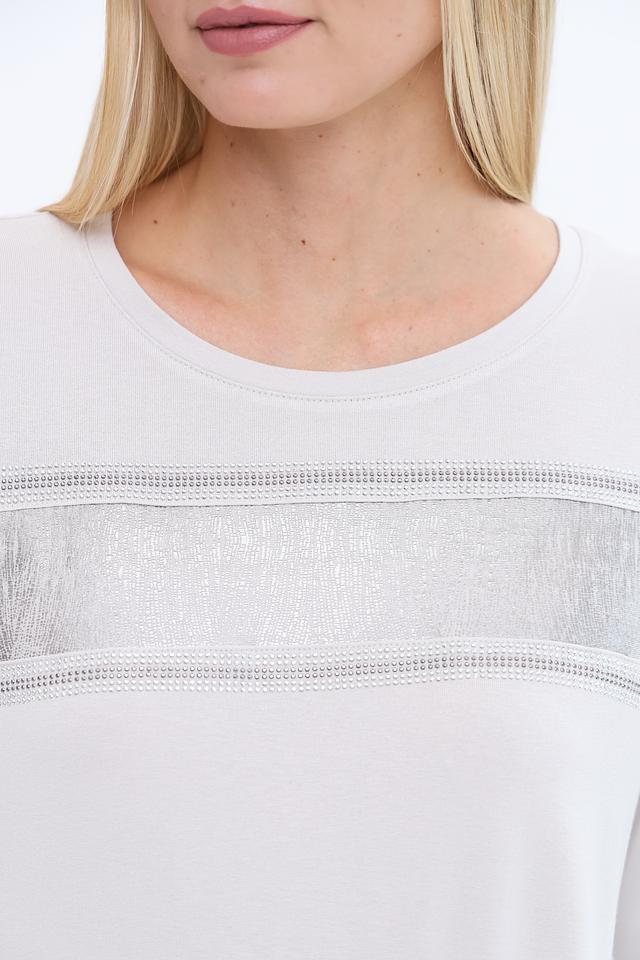 Лонгслив имеет светло-серый цвет и украшен декоративной полосой из страз, которая придает ему элегантный и праздничный вид. Вырез горловины круглый, а рукава – три четверти, что делает его универсальным для различных образов.