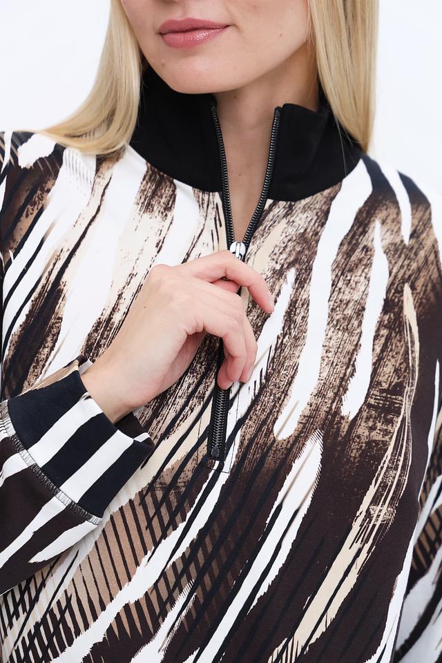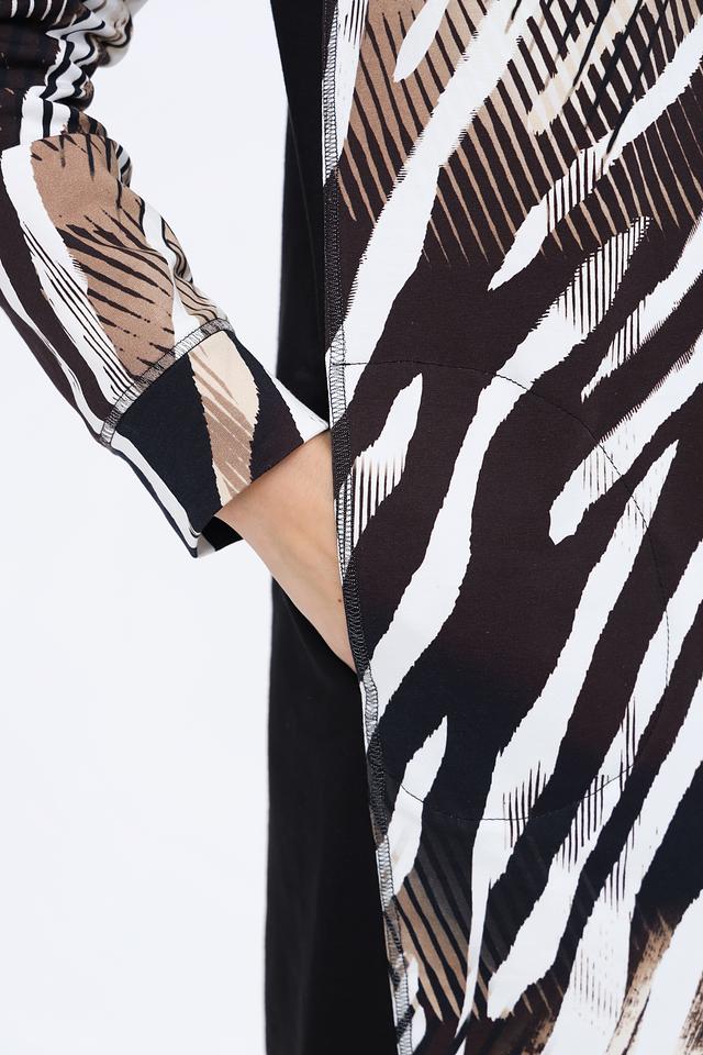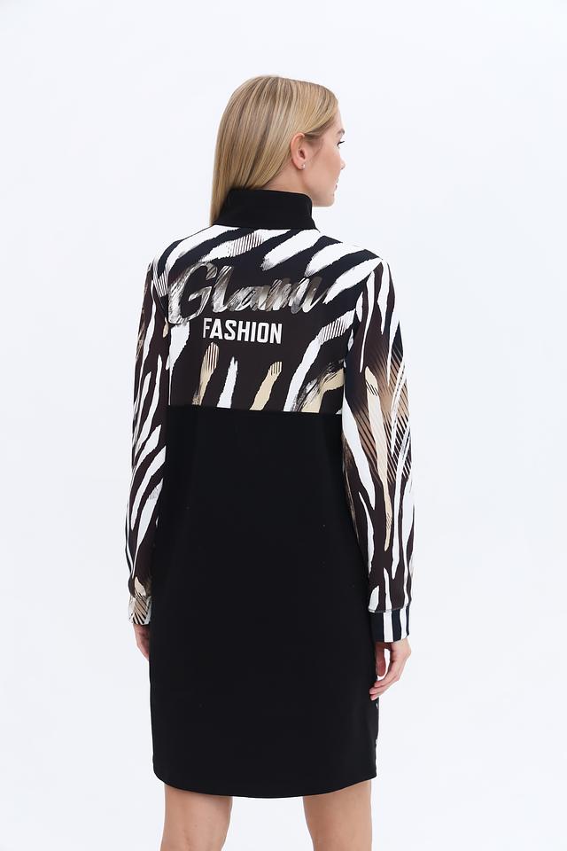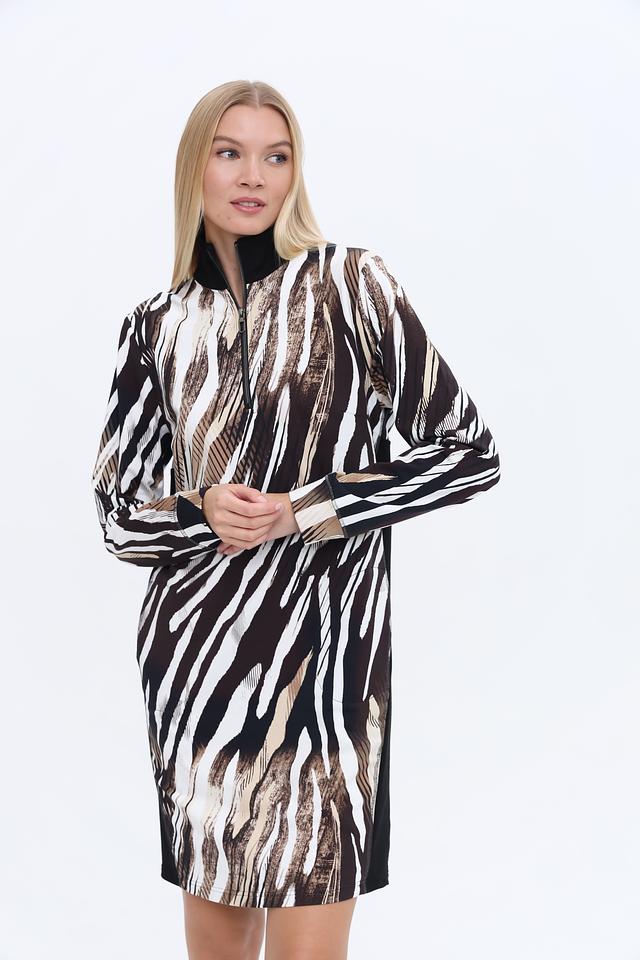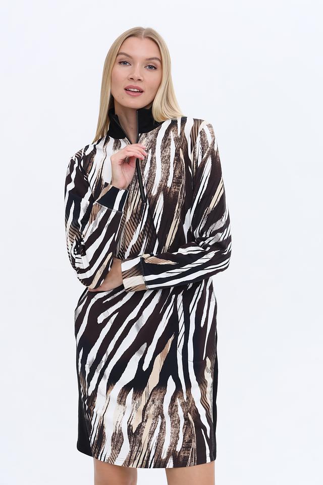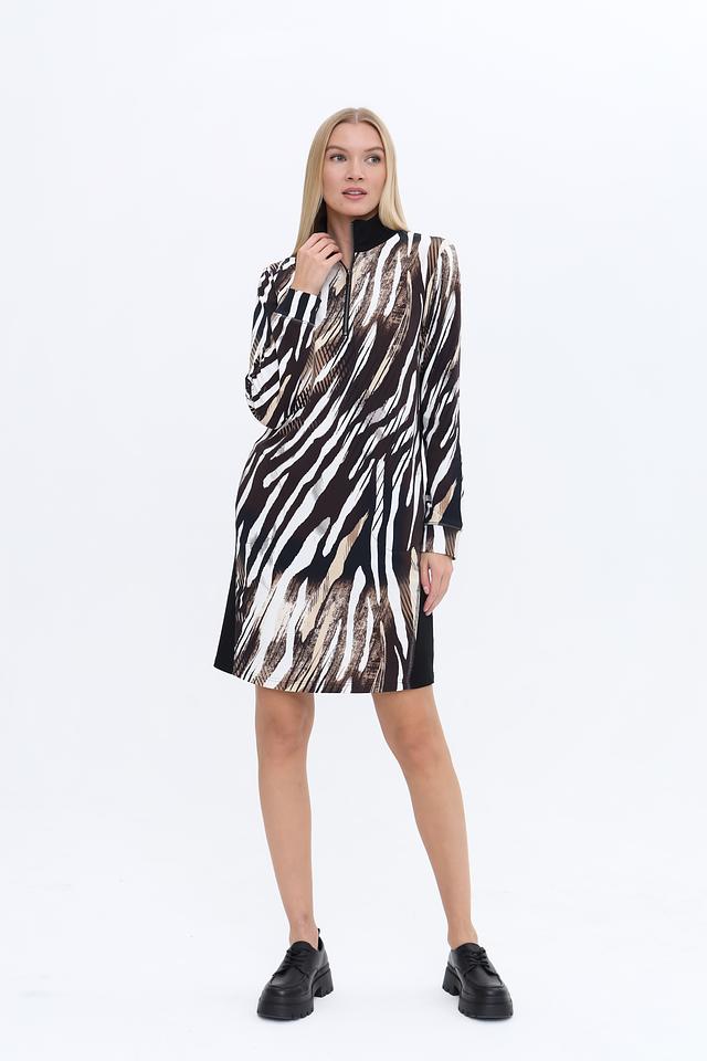 Платье имеет длину до колена и длинный рукав. Застежка – молния. Особенностью модели является яркий и стильный принт, имитирующий шкуру зебры, выполненный в сочетании черного, белого и бежевого цветов.