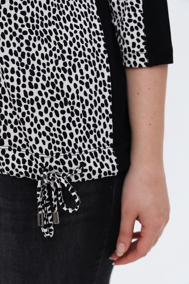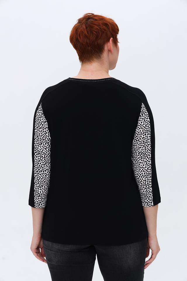 Женский лонгслив Tuzzi чёрно-белого цвета с оригинальным сочетанием полоски и леопардового принта. Модель с рукавом 3/4 и округлым вырезом горловины, выполнена из мягкой и приятной к телу вискозы с добавлением эластана. Состав: вискоза 95%, эластан 5%