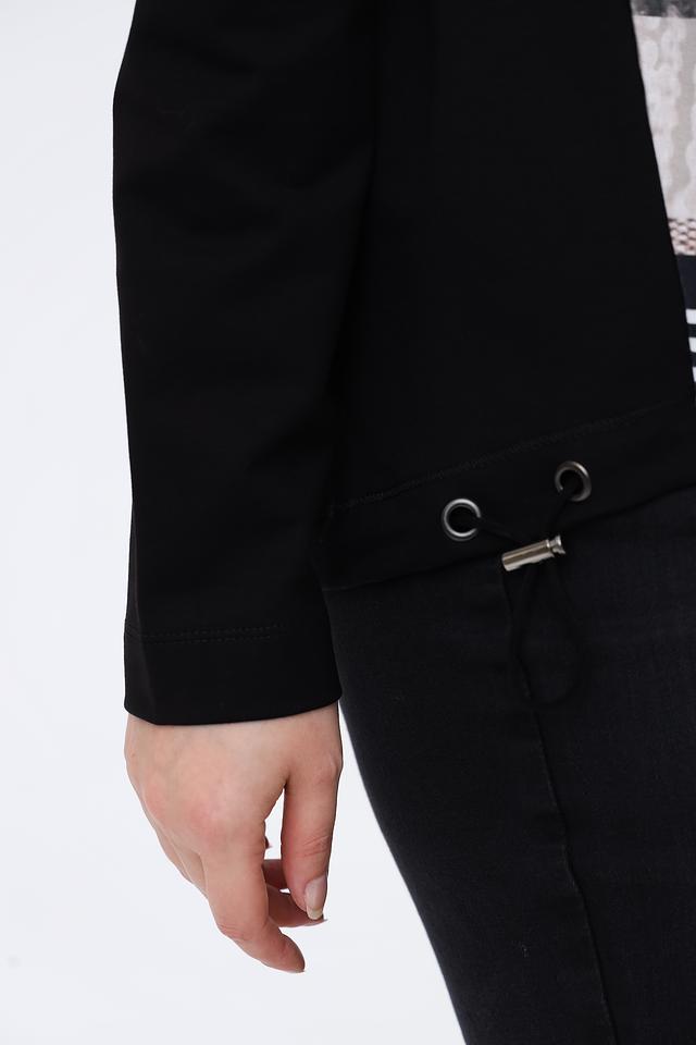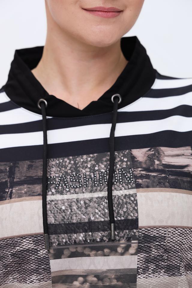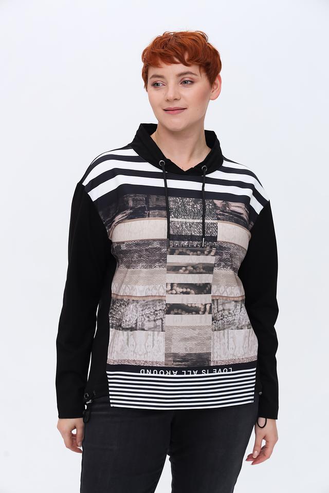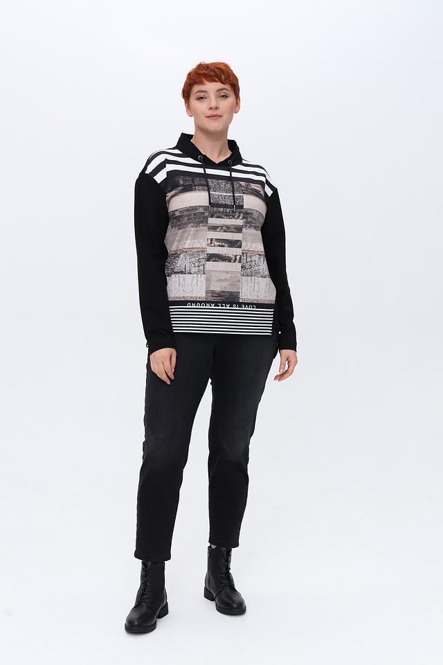 Женский пуловер Tuzzi чёрного цвета с ярким принтом и капюшоном станет стильным дополнением к вашему гардеробу. Модель выполнена из мягкого и приятного к телу материала, обеспечивающего комфорт в носке. Состав: хлопок 75%, полиэстер 20%, эластан 5%