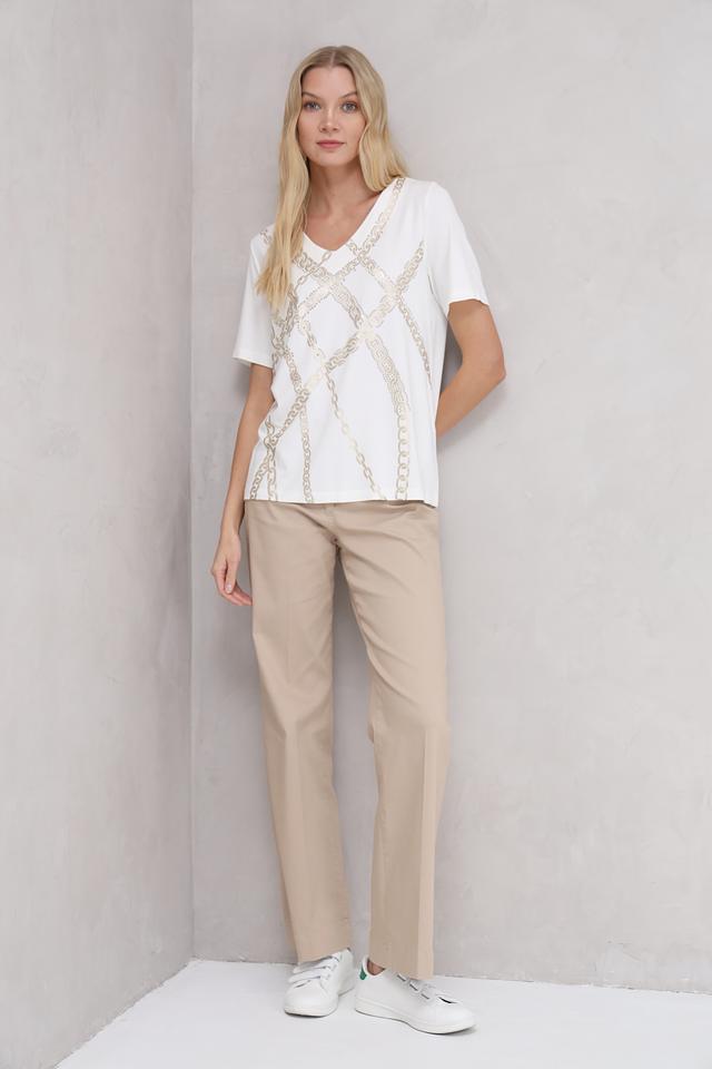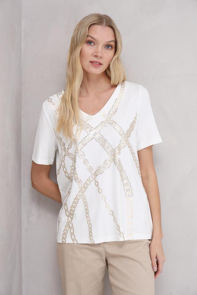 Белая футболка Tuzzi с V-образным вырезом украшена золотистыми цепочками. Модель из мягкой вискозы с добавлением эластана обеспечит комфорт и свободу движений. Состав: вискоза 95%, эластан 5%