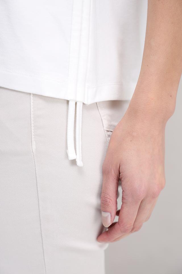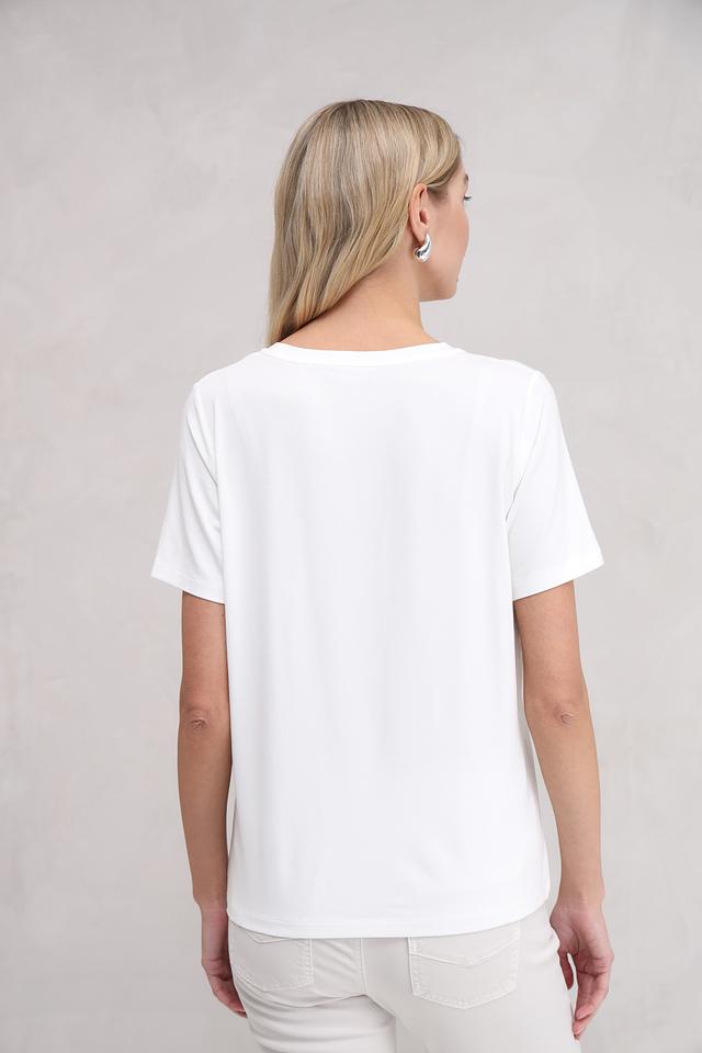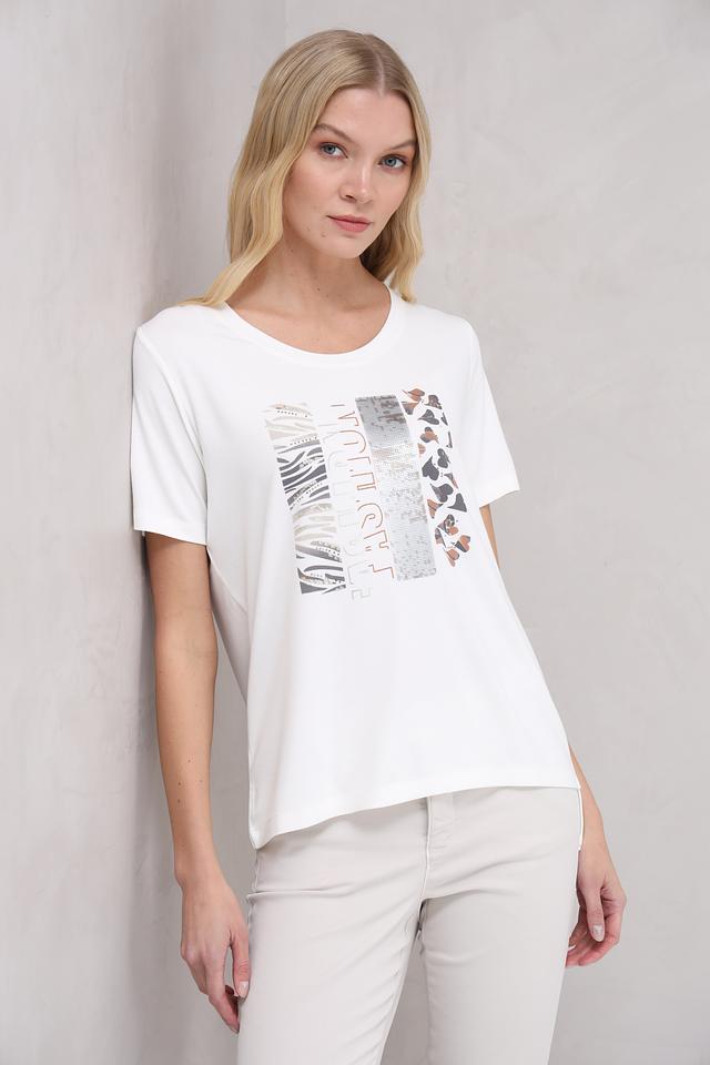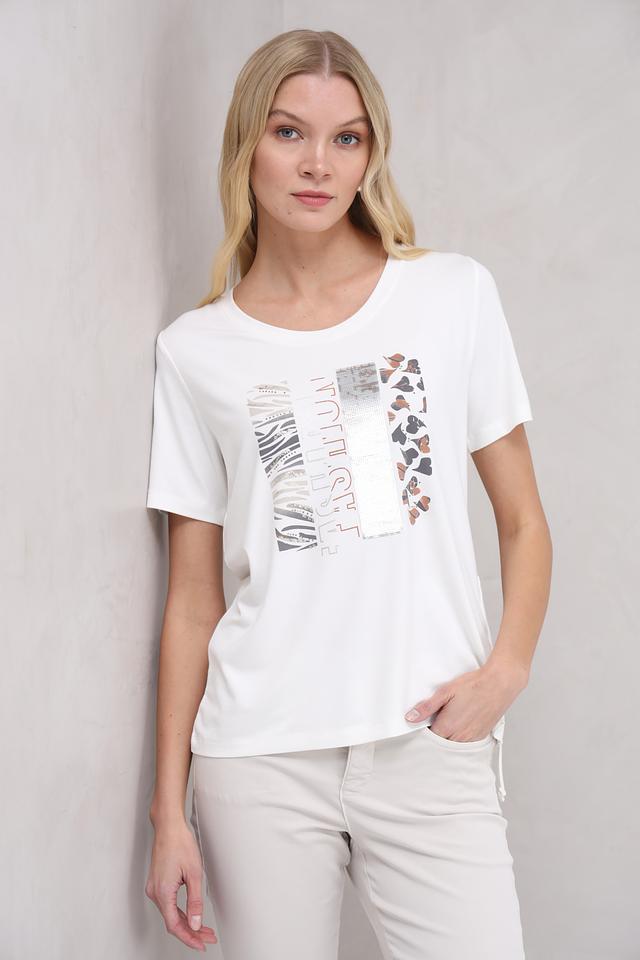 Белая футболка Tuzzi с оригинальным принтом – стильное и комфортное решение для повседневного образа. Изготовлена из мягкой вискозы с добавлением эластана, обеспечивающего удобную посадку. Состав: вискоза 95%, эластан 5%