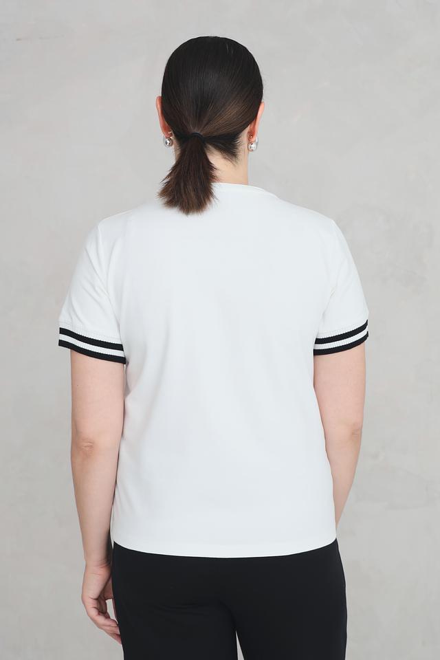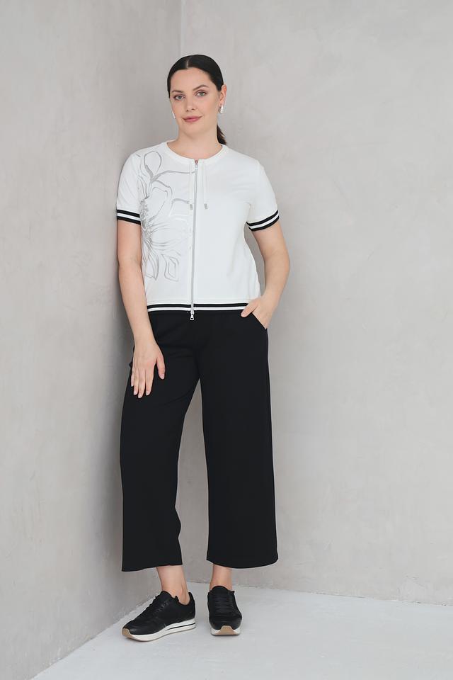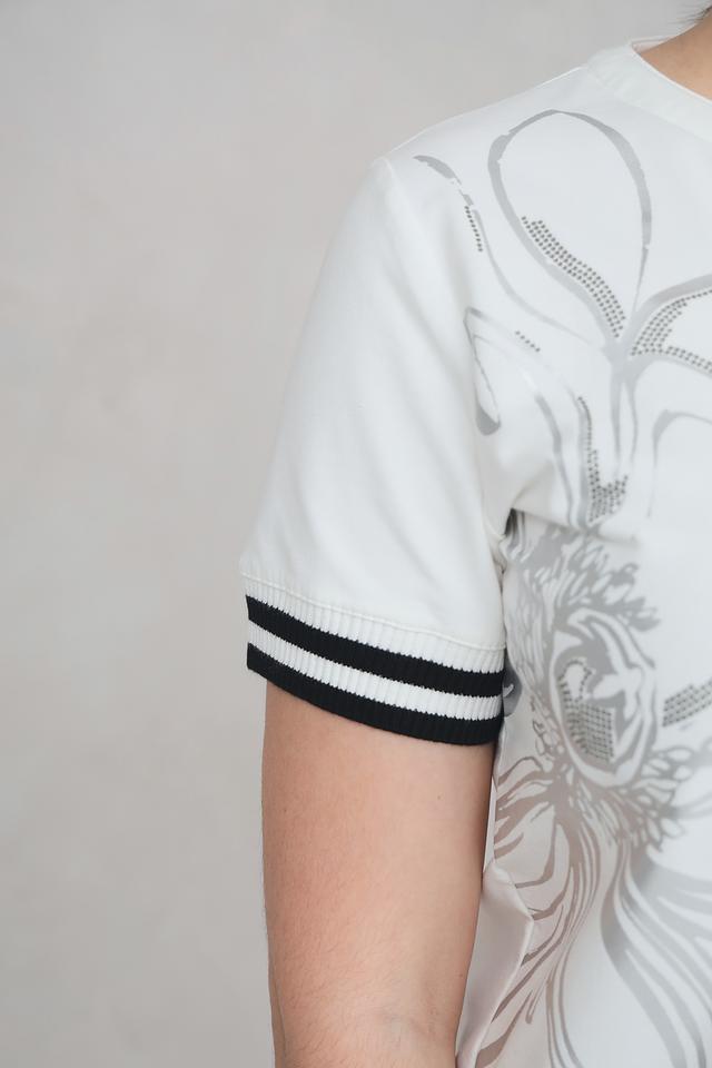 Жакет имеет короткие рукава с чёрно-белой полоской, что придает ему спортивный шик. Застежка-молния позволяет регулировать степень прилегания. Состав ткани включает хлопок, полиэстер и эластан, благодаря чему жакет приятен к телу, хорошо держит форму и не мнется.