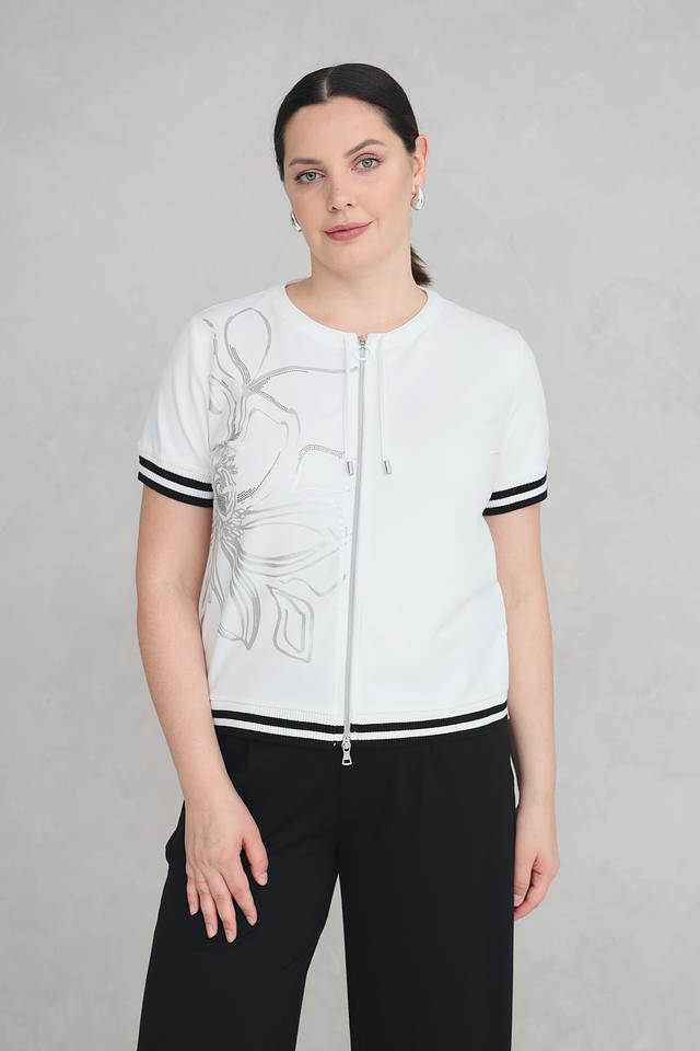 Белый жакет Tuzzi с короткими рукавами и цветочным принтом – стильное решение для создания лёгкого и женственного образа. Модель выполнена из хлопка с добавлением полиэстера и эластана, что обеспечивает комфорт и удобство в носке. Состав: хлопок 75%, полиэстер 20%, эластан 5%